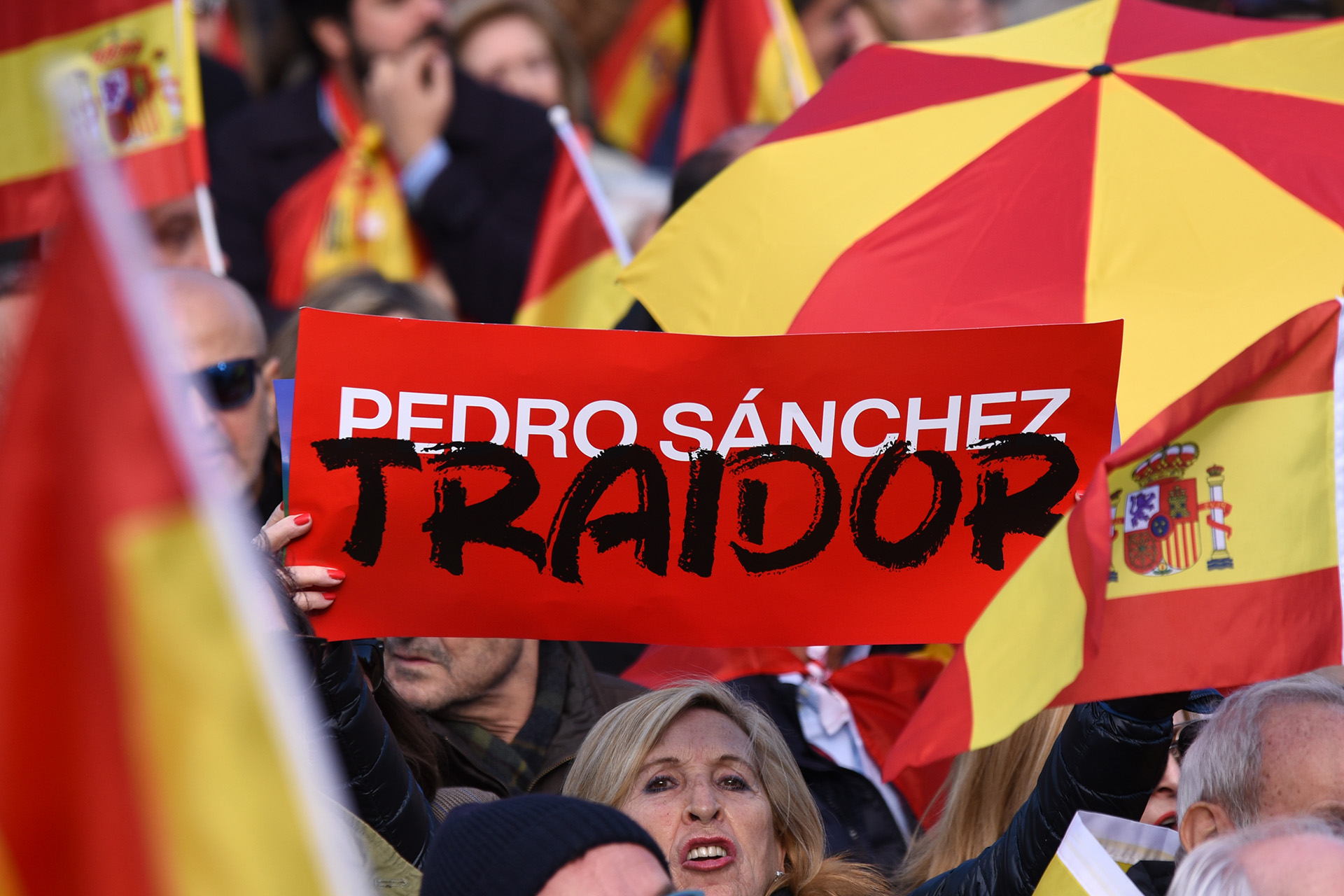 Manifestantes portan una pancarta con los socios de Sánchez: Pablo Iglesias, Otegi y Junqueras y le acusan de traidor.
