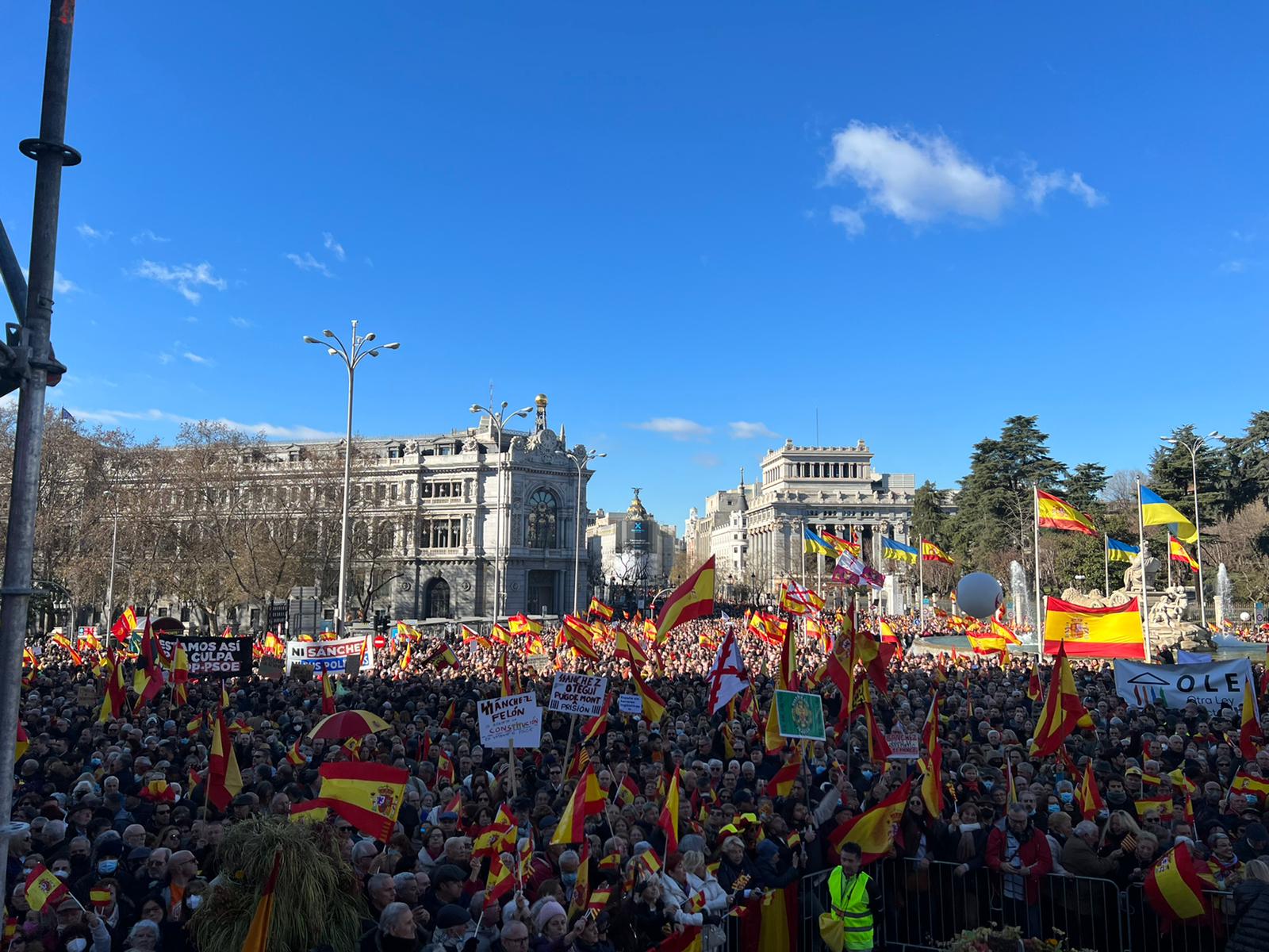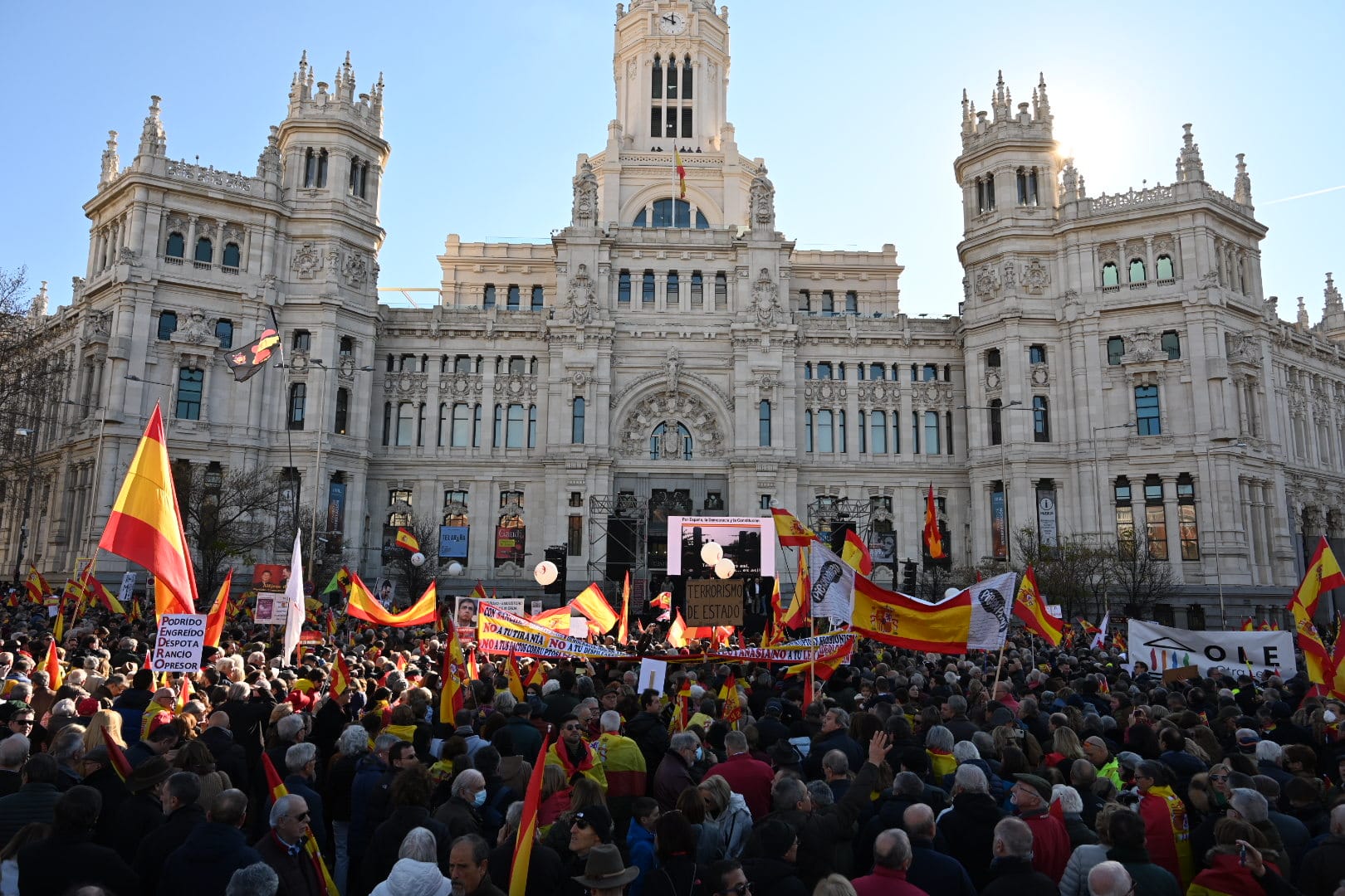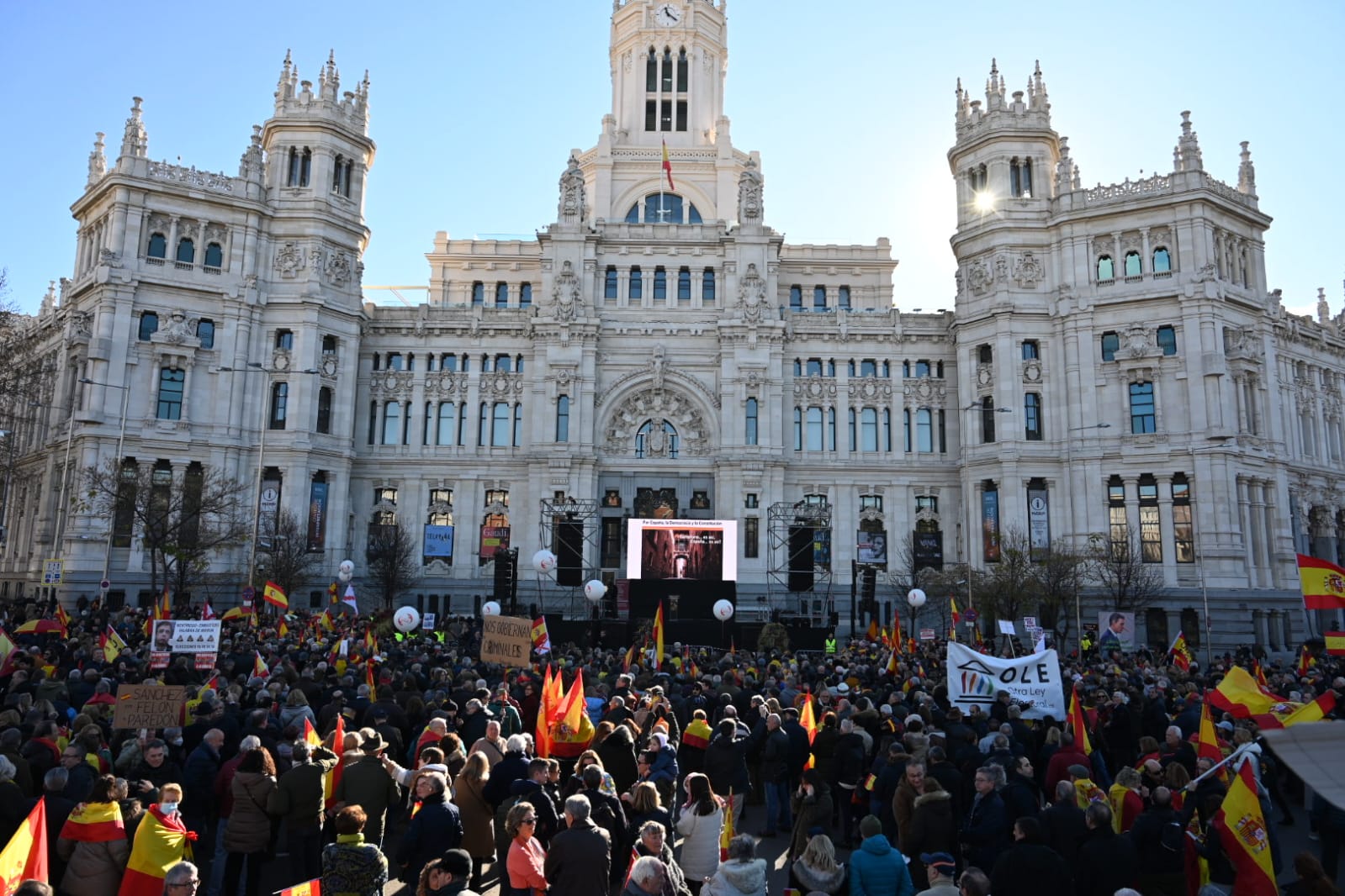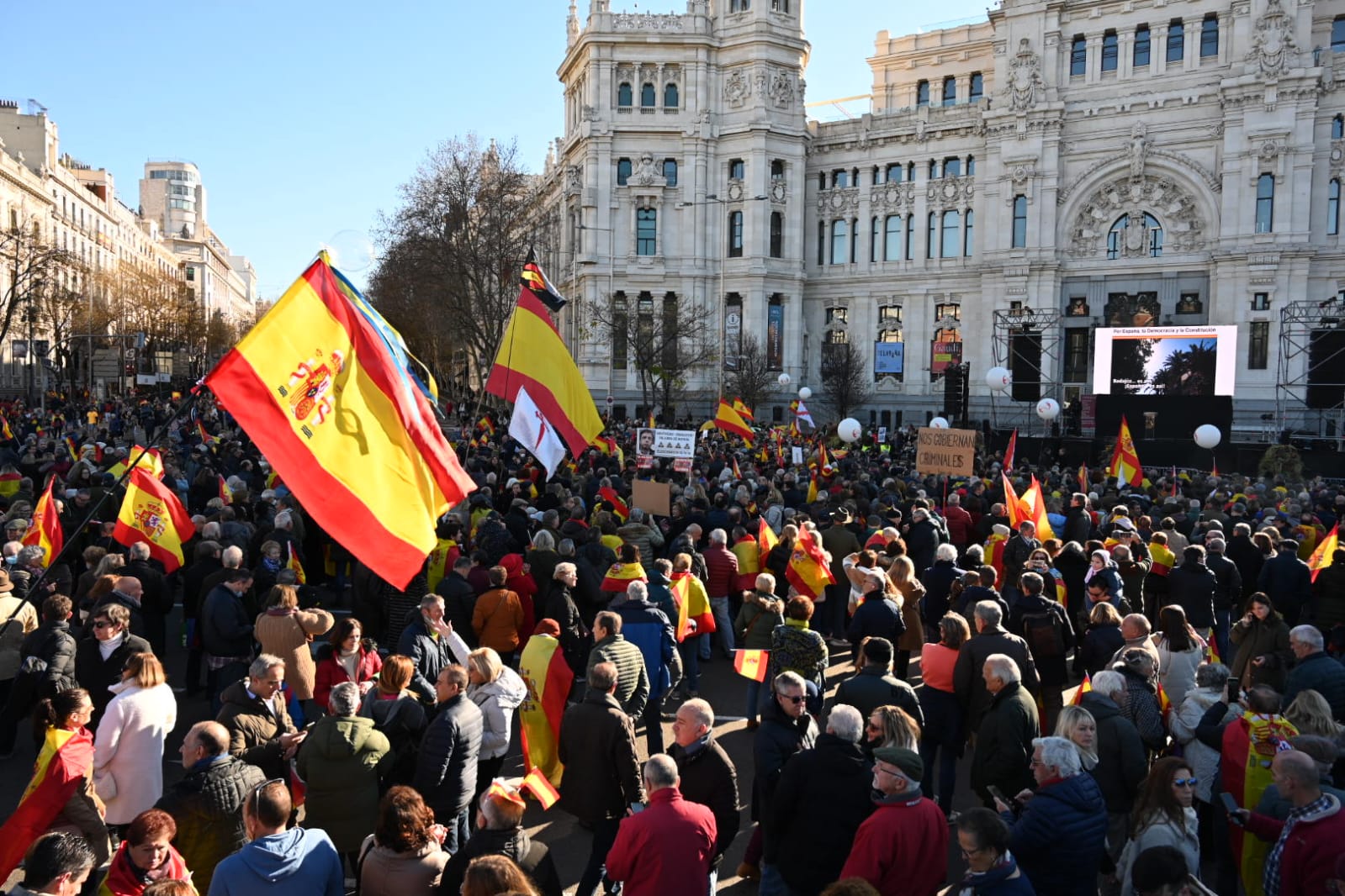 La sociedad civil se da cita por la libertad, la democracia y la Constitución al grito de "Sánchez dimisión" en una multitudinaria manifestación en la plaza de Cibeles, en Madrid.