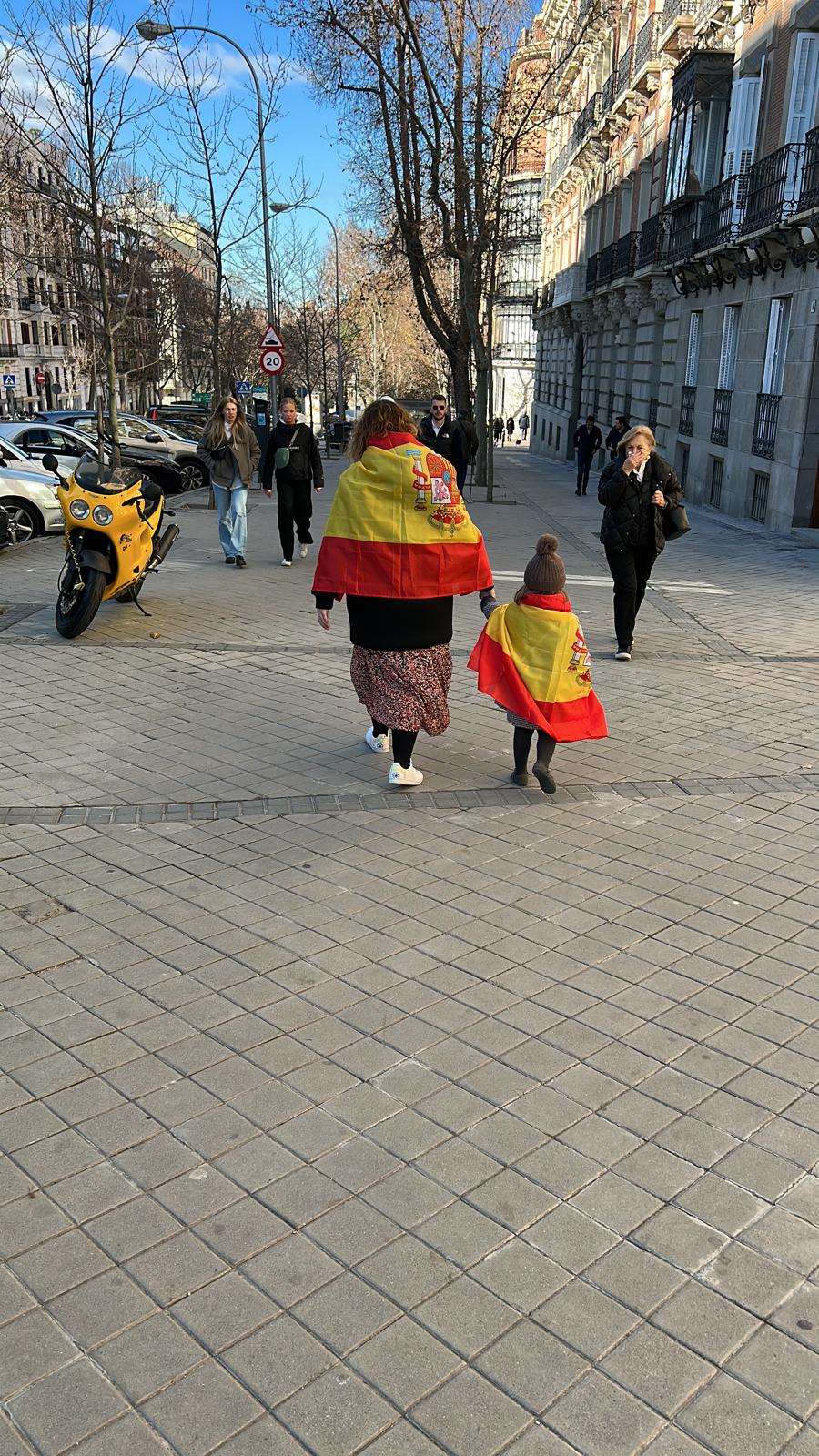 Tres generaciones cubiertos con banderas de España camino de Cibeles.