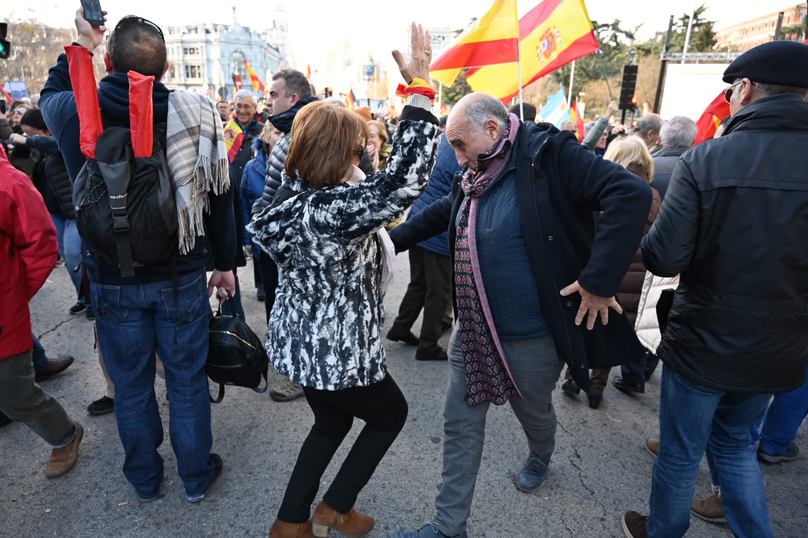 Una pareja arranca a bailar durante la manifestación contra Sánchez.