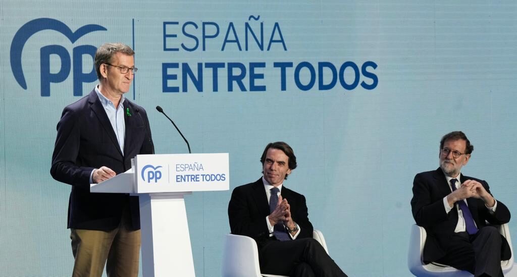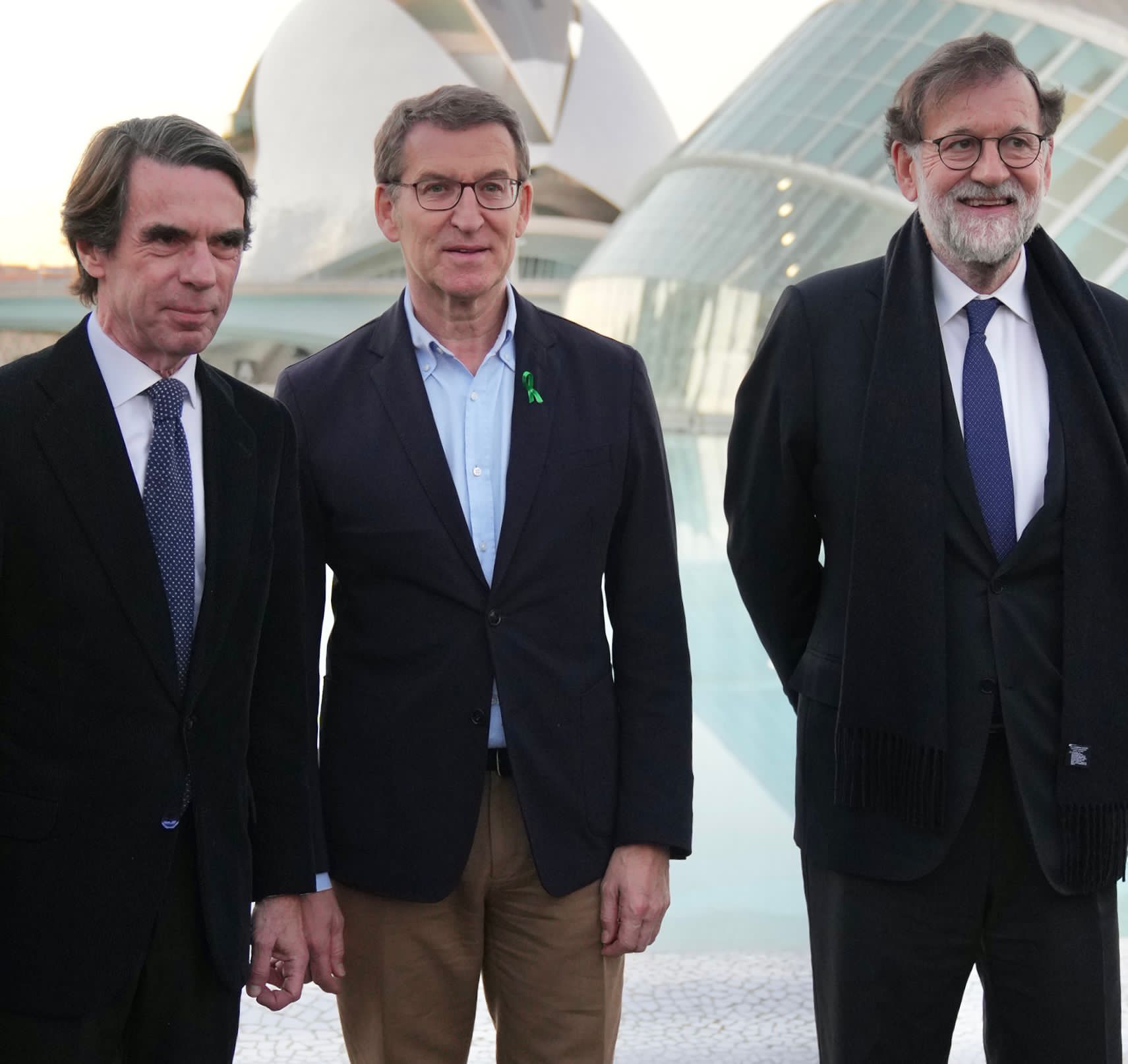 José María Aznar y Mariano Rajoy protagonizaron este sábado en Valencia una imagen inédita: los dos expresidentes del gobierno del Partido Popular apoyando a un candidato de su formación a la Moncloa. Una presencia que agradeció Alberto Núñez Feijóo nada más comenzar su discurso: "Cuando un partido olvida lo que fue no va a encontrar su sitio para ubicarse en el presente y, sobre todo, va a estar perdido de forma permanente para diseñar el futuro. Por eso, lo primero que tiene que hacer un partido es respetar su legado y yo vengo aquí a decir que respeto y admiro y seguiré el legado de los presidentes Aznar y Rajoy".