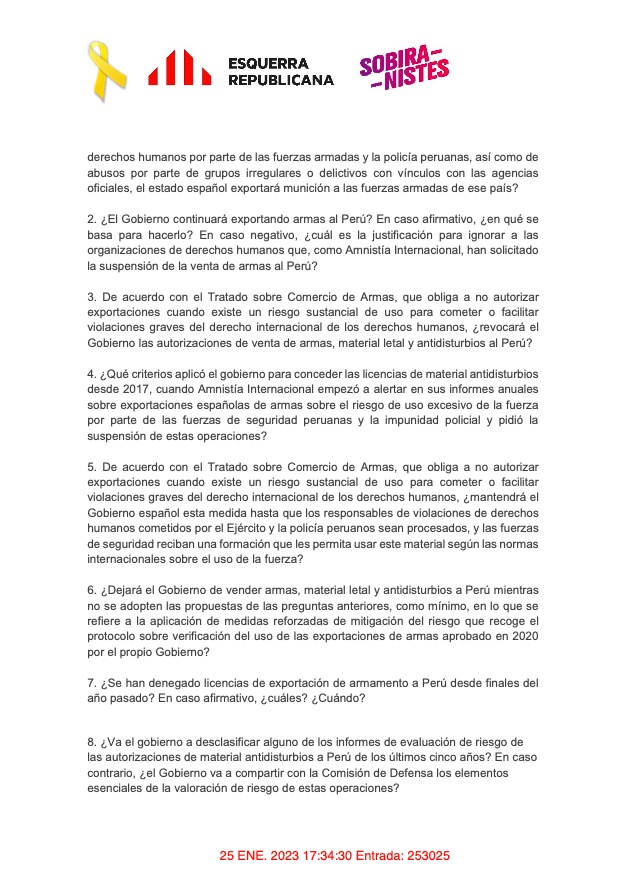 Los de Gabriel Rufián y Oriol Junqueras aludían ya al famoso informe de "Amnistía Internacional, así como de otras organizaciones de la sociedad civil". "Amnistía Internacional, pone el acento sobre las estrechas relaciones comerciales de armamento entre el Estado español y Perú, existiendo "un riesgo claro de que el material de origen español esté sirviendo para acallar al pueblo peruano de forma violenta e ilegal", según declara el director de Amnistía, Esteban Beltrán", afirmó ERC. Y, por ello, ERC exigió explicaciones formales al Gobierno de Sánchez por la autorización de "las exportaciones de armas españolas". ERC requería una aclaración formal sobre los siguientes aspectos: "¿El Gobierno continuará exportando armas al Perú? En caso afirmativo, ¿en qué se basa para hacerlo? En caso negativo, ¿cuál es la justificación para ignorar a las organizaciones de derechos humanos que, como Amnistía Internacional, han solicitado la suspensión de la venta de armas al Perú?" Y reiteraba: "¿Dejará el Gobierno de vender armas, material letal y antidisturbios a Perú mientras no se adopten las propuestas de las preguntas anteriores, como mínimo, en lo que se refiere a la aplicación de medidas reforzadas de mitigación del riesgo que recoge el protocolo sobre verificación del uso de las exportaciones de armas aprobado en 2020 por el propio Gobierno?"