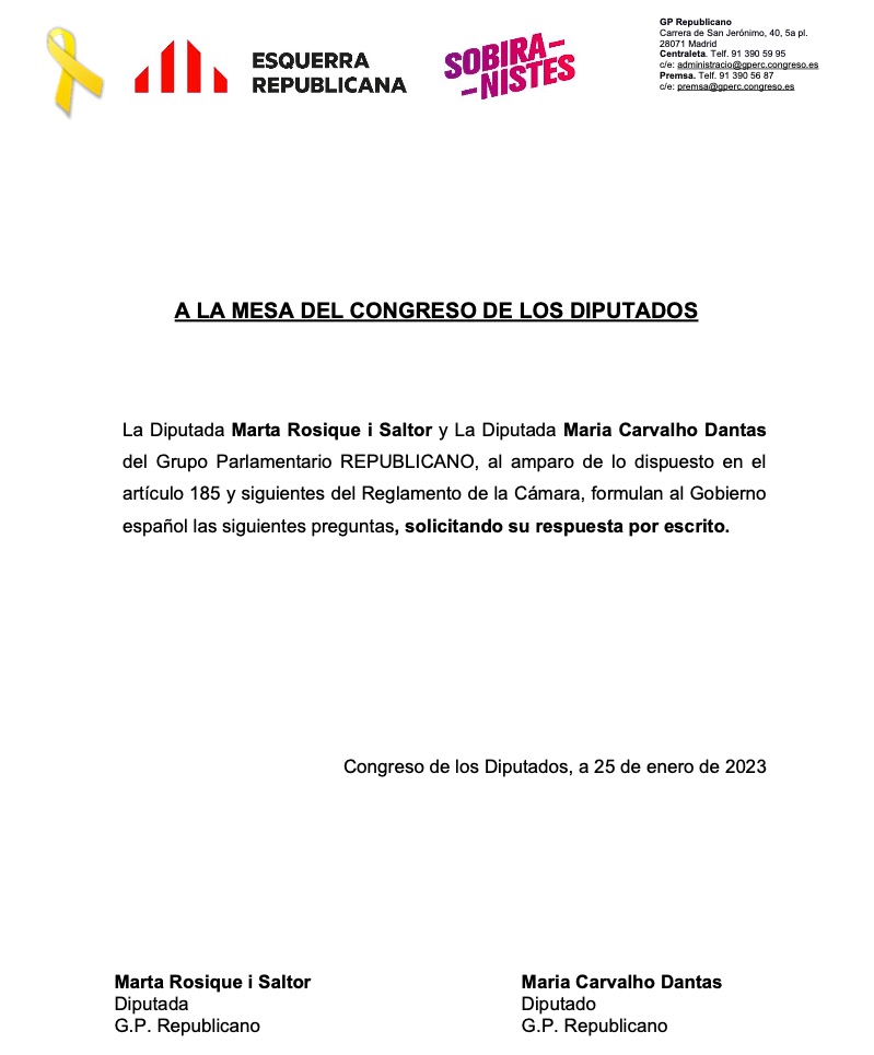 La reacción en España de ERC no se hizo esperar demasiado: el 25 de enero registró su escrito solicitando al Gobierno de España dejar sin material antidisturbios al Gobierno constitucional y democrático de Perú: "Desde la detención de Pedro Castillo a finales del pasado año, Perú ha vivido una sucesión de movilizaciones en la calle, desestabilización política y, sobre todo, actuaciones desproporcionadas de las fuerzas de seguridad y del ejército", señaló en su documento ERC.