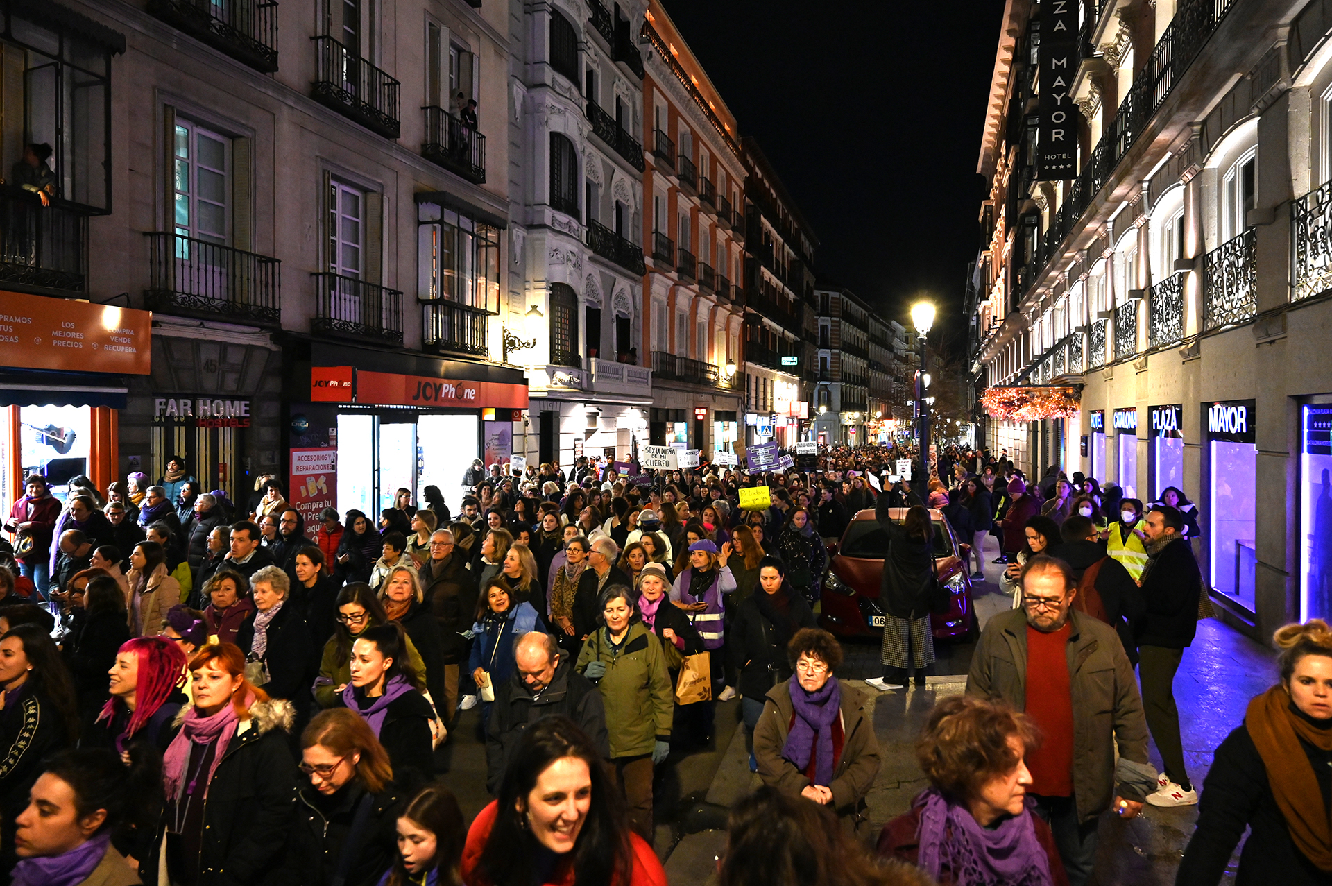 Miles de personas han marchado por el centro de Madrid en las dos manifestaciones convocadas por el Día Internacional de la Mujer, que han vuelto a teñir durante horas las calles de morado a pesar de las diferencias en el movimiento feminista.