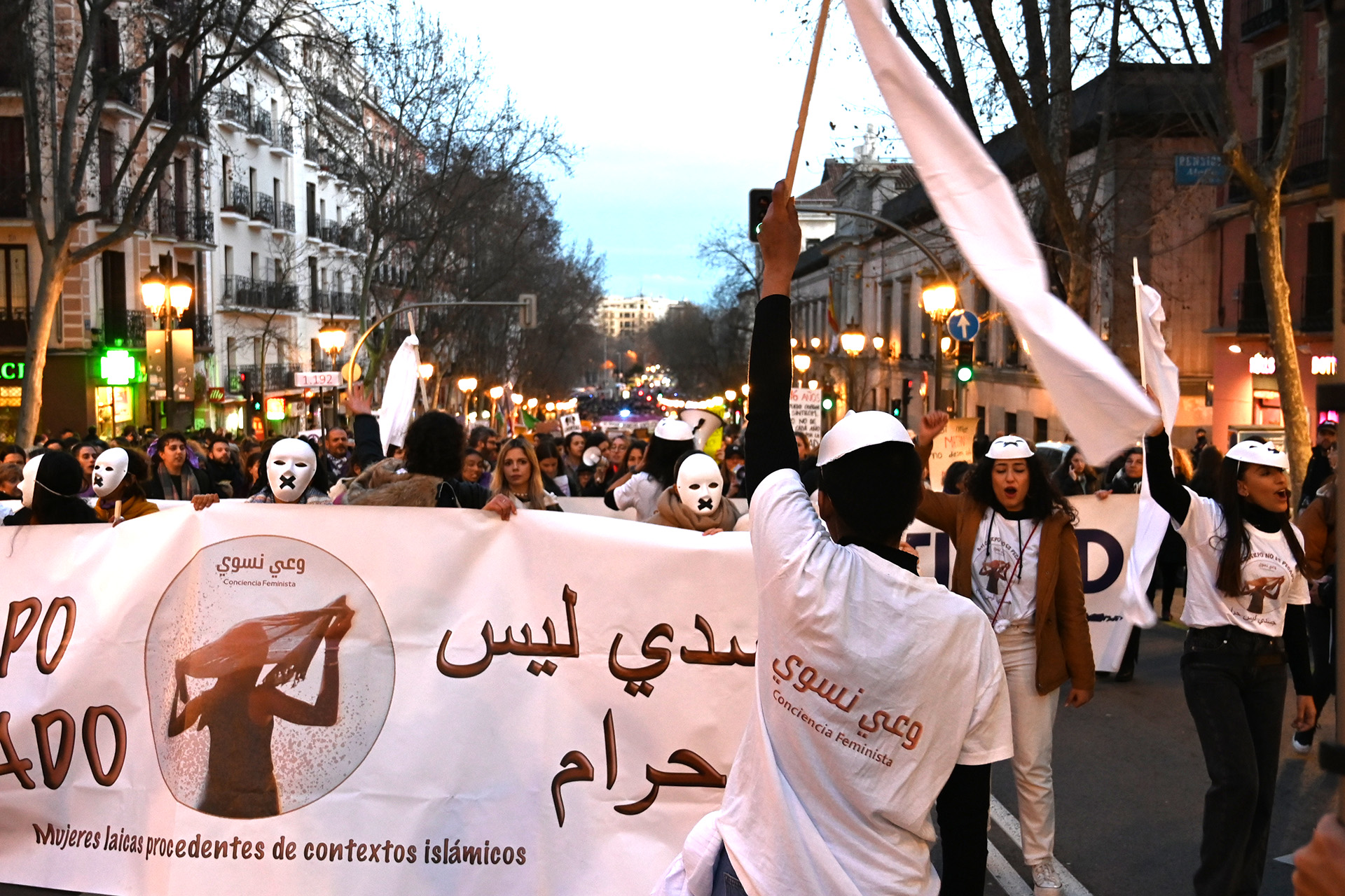 Una de las cabeceras de la manifestación con un grupo de mujeres bajo el lema “Mujeres procedentes de contextos islámicos".