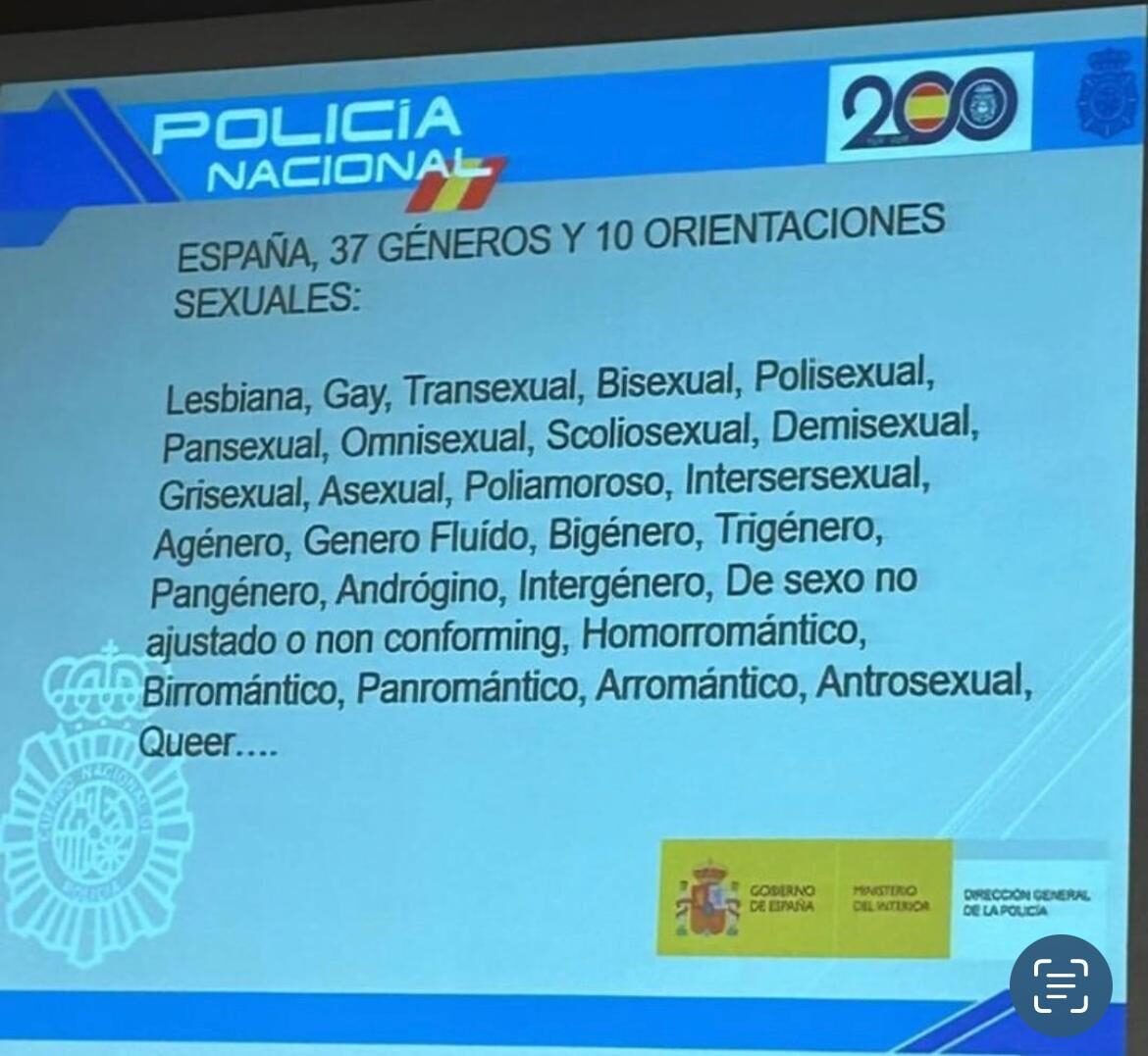 La pantalla que puede verse hoy publicada en Libertad Digital es una de las expuestas a los agentes estos días en los cursos de formación de "género". Los cursos se imparten con el sello de la Dirección General de Policía, del Ministerio del Interior y del Gobierno de España. Y recogen la existencia de 37 géneros y 10 orientaciones sexuales. Los agentes consultados por este diario no dejan de preguntarse cuál es el sentido de estas clases "si la aplicación de la ley es la misma para todos los ciudadanos". "No llegamos a entender el objetivo de la formación. A nosotros nos da igual la orientación o el género. Protegemos exactamente igual los derechos de todas las personas. Y, si lo que quieren es que haya determinadas singularidades en los cacheos y demás, entonces lo que necesitamos son medios y protocolos claros". Y no los hay.