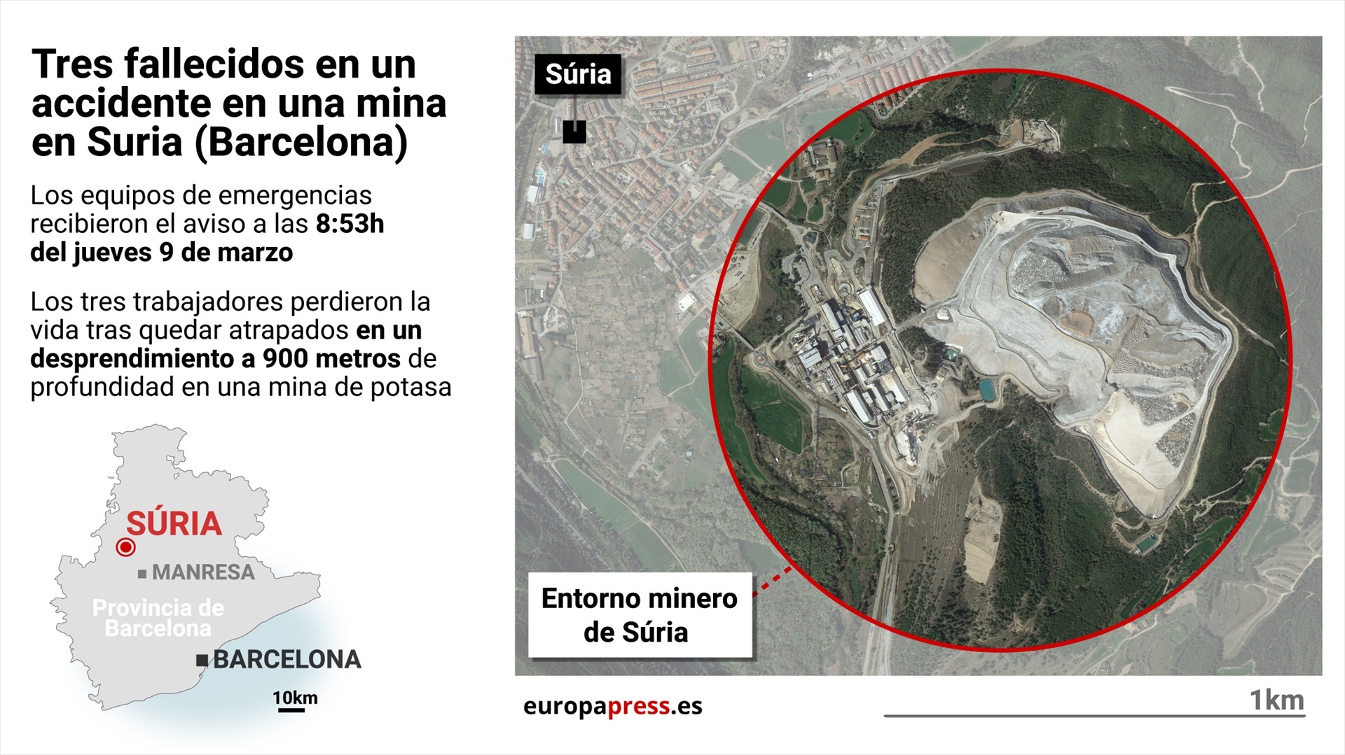 Tres personas han muerto este jueves tras quedar atrapados en un desprendimiento a 900 metros de profundidad en una mina de potasa de Suria (Barcelona).