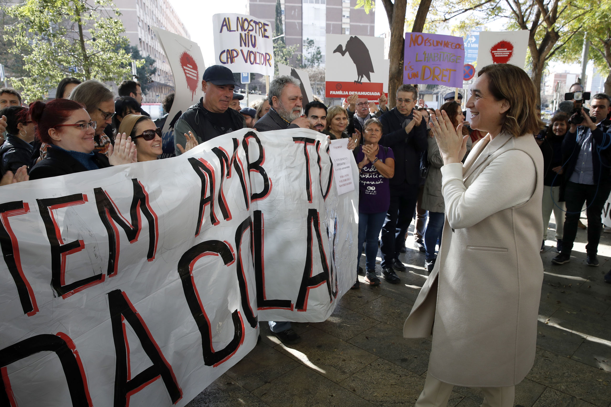 A diferencia de la vez anterior, Colau ha accedido al juzgado por la puerta principal, "escoltada" por sus dos abogados, Olga Tubau (que defendió a Trapero en la Audiencia Nacional) y Àlex Solá (uno de los letrados de Jordi Cuixart en el juicio en el Tribunal Supremo por el golpe de Estado separatista), así como por el concejal Marc Serra. Además, ha saludado y ha sido ovacionada por un centenar de personas congregadas a tal efecto con pancartas en contra de los denominados "fondos buitres".