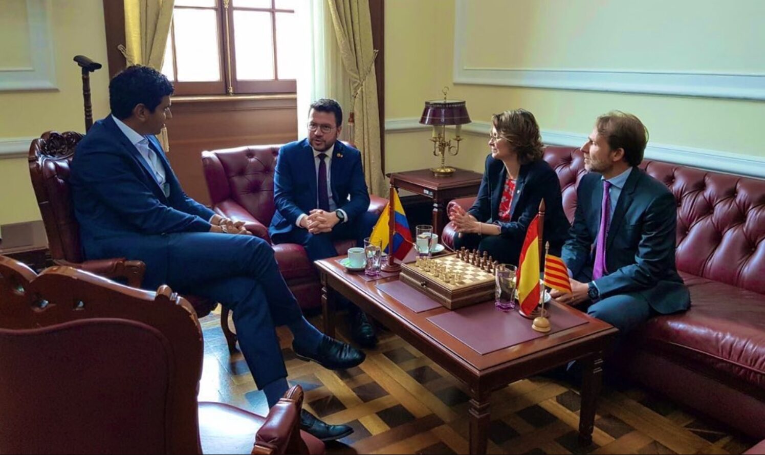 Aragonès acudió al encuentro con el presidente del congreso colombiano acompañado por la consejera de Acción Exterior y Unión Europea de la Generalidad, Meritxell Serret, así como de un cargo de la embajada española en Colombia que tampoco aparece en la foto difundida por la Generalidad pero sí por el asistente de Puigdemont.
