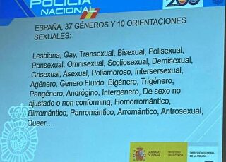 Los cursos para los agentes ya han incluido una formación en materia de "género" con explicaciones sobre todas las opciones identificadas por los colectivos y partidos que impulsan esta materia y que han sido asumidas ya oficialmente en España: 37 géneros y 10 orientaciones sexuales. Entre ellas, la "omnisexual, grisexual, poliamoroso, homorromántico, antrosexual" y muchas otras. Los agentes se preguntan cuál es el interés de este adoctrinamiento si ellos "aplican la ley a todos por igual".