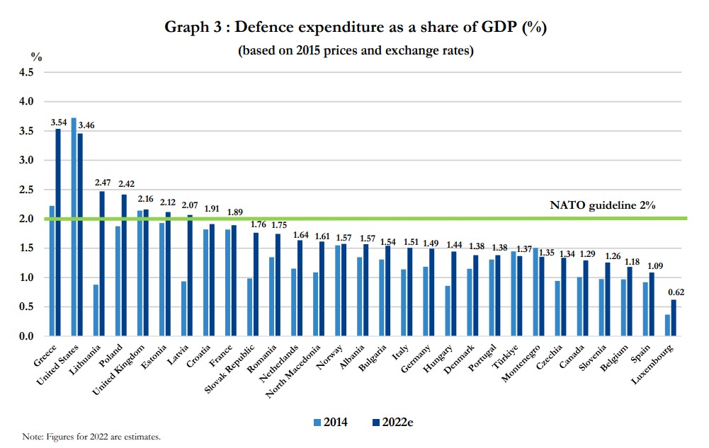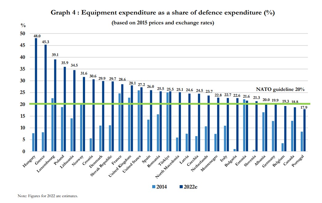 Los datos dicen que 25 de los 29 países aliados están cumpliendo lo pactado. Dos están por encima del 19 por ciento y el peor invirtió el 17,9 por ciento. En este caso, España cumple el compromiso y se sitúa en un 26 por ciento destinado a inversión, situándose en el puesto 13. Hay que destacar que hay dos países por encima del 45 por ciento en inversión (Grecia y Hungría) y siete por encima del 30 por ciento: Grecia, Hungría, Luxemburgo, Polonia, Lituania, Noruega y Croacia.