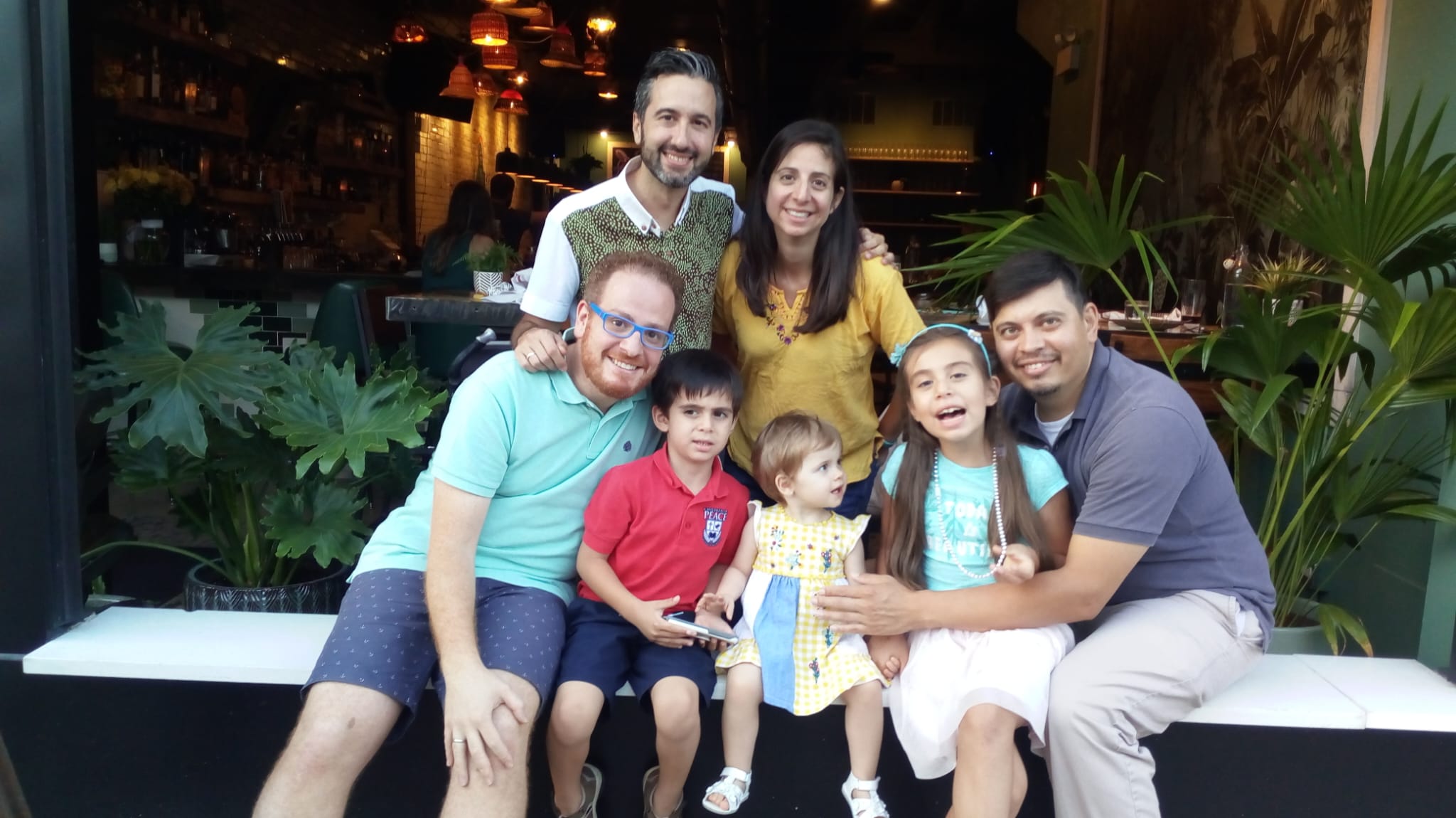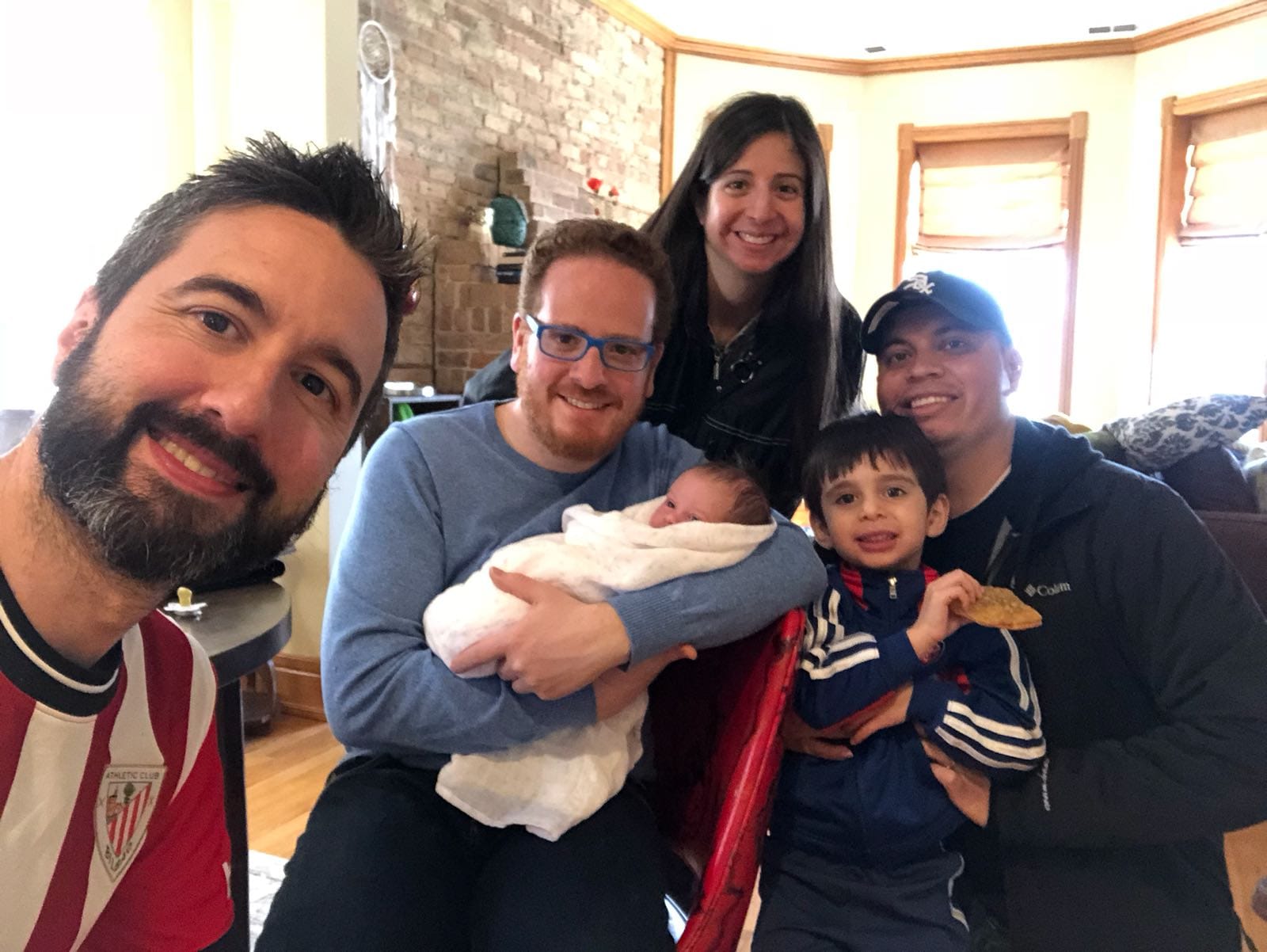 Pablo y Rafa con la familia de la mujer gestante, tras el nacimiento de su hija en EEUU.