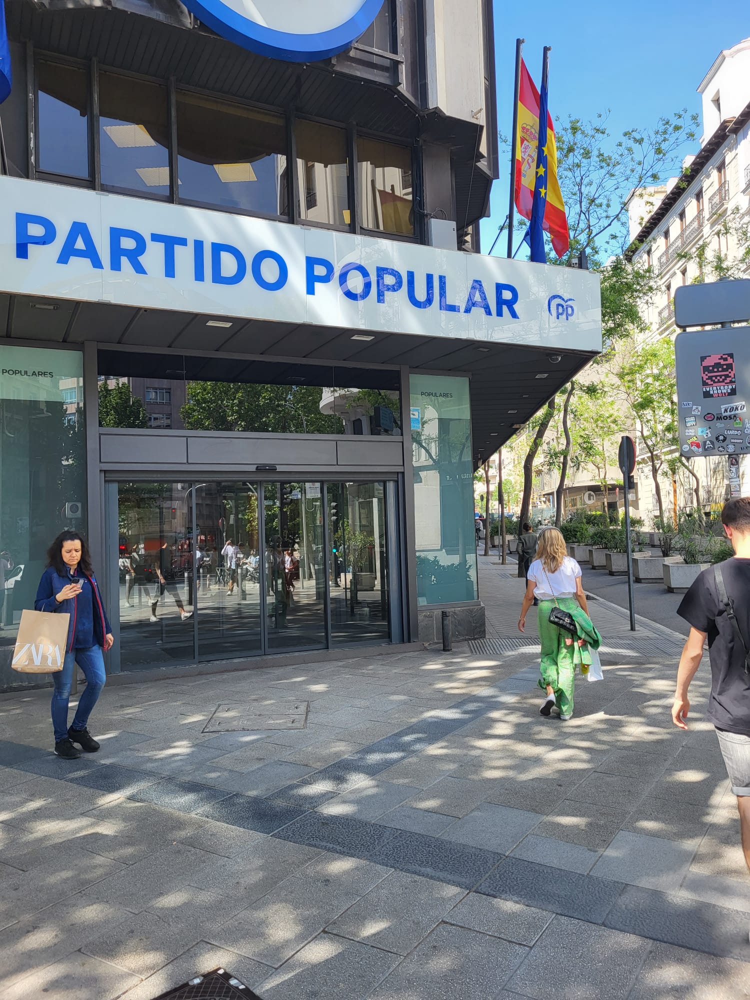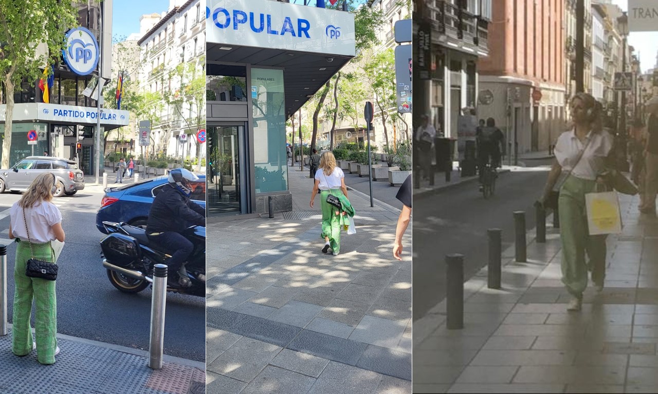 En otro momento de su relajado paseo por Madrid, la ministra de Trabajo fue captada cruzando delante de la sede del PP en la calle Génova.