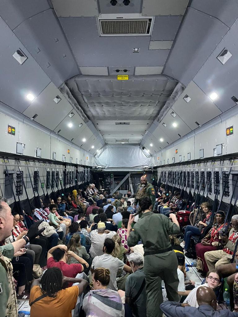 En el avión a Yibuti había casi un centenar de personal. Además de los españoles, había ciudadanos portugueses, italianos, polacos, irlandeses, mexicanos, venezolanos, colombianos y argentinos. Su países había pedido a España que les ayudase a salir de Sudán. Foto: Ministerio de Defensa.