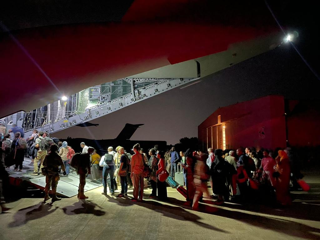 En el operativo militar español han participado cinco aviones de transporte del Ejército del Aire y el Espacio (cuatro aeronaves A400M y un A330), así como un número, aproximadamente, de algo más de 200 efectivos del Ejército del Aire y del Ejército de Tierra. Foto: Ministerio de Defensa.