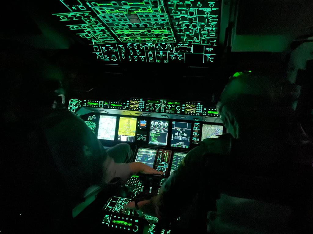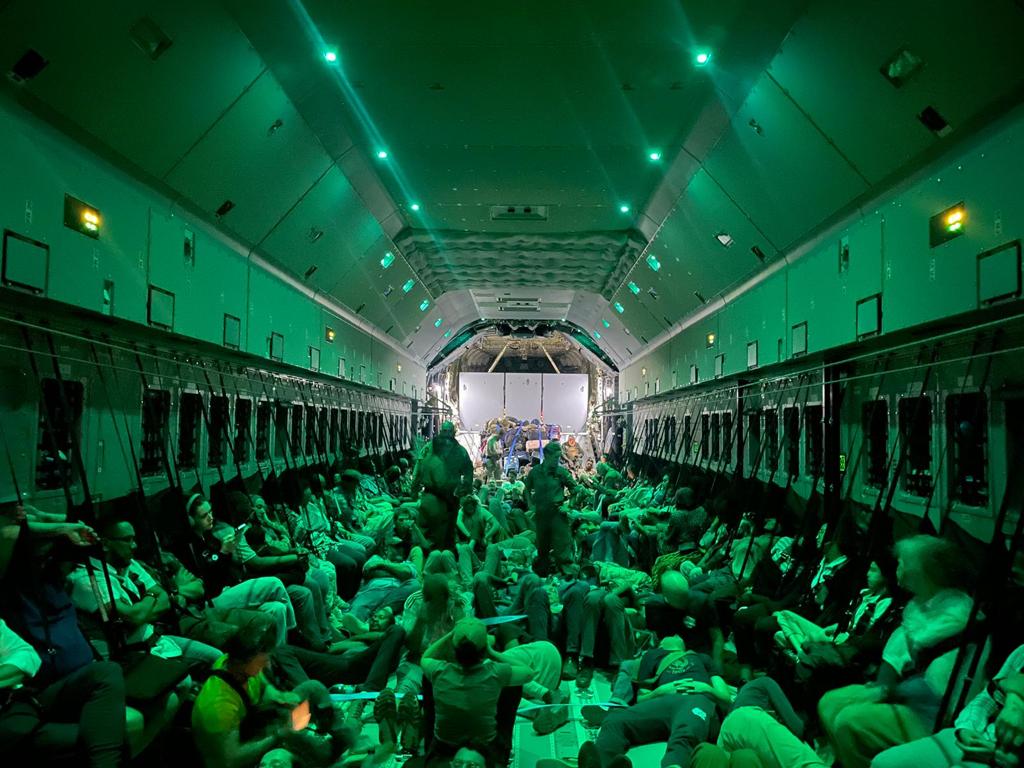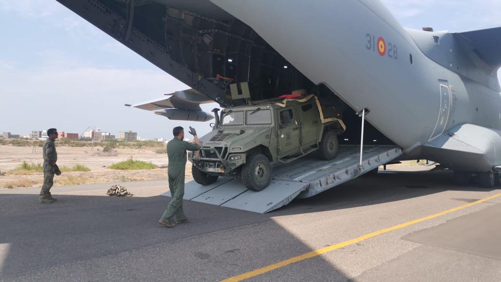 Una vez despegó el avión con los ciudadanos atrapados, lo fueron haciendo los aviones militares que había llevado a los militares que dieron seguridad al convoy y los que transportaron los vehículos blindados que se utilizaron en la misión. Foto: Ministerio de Defensa.