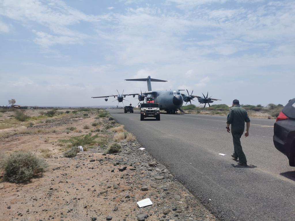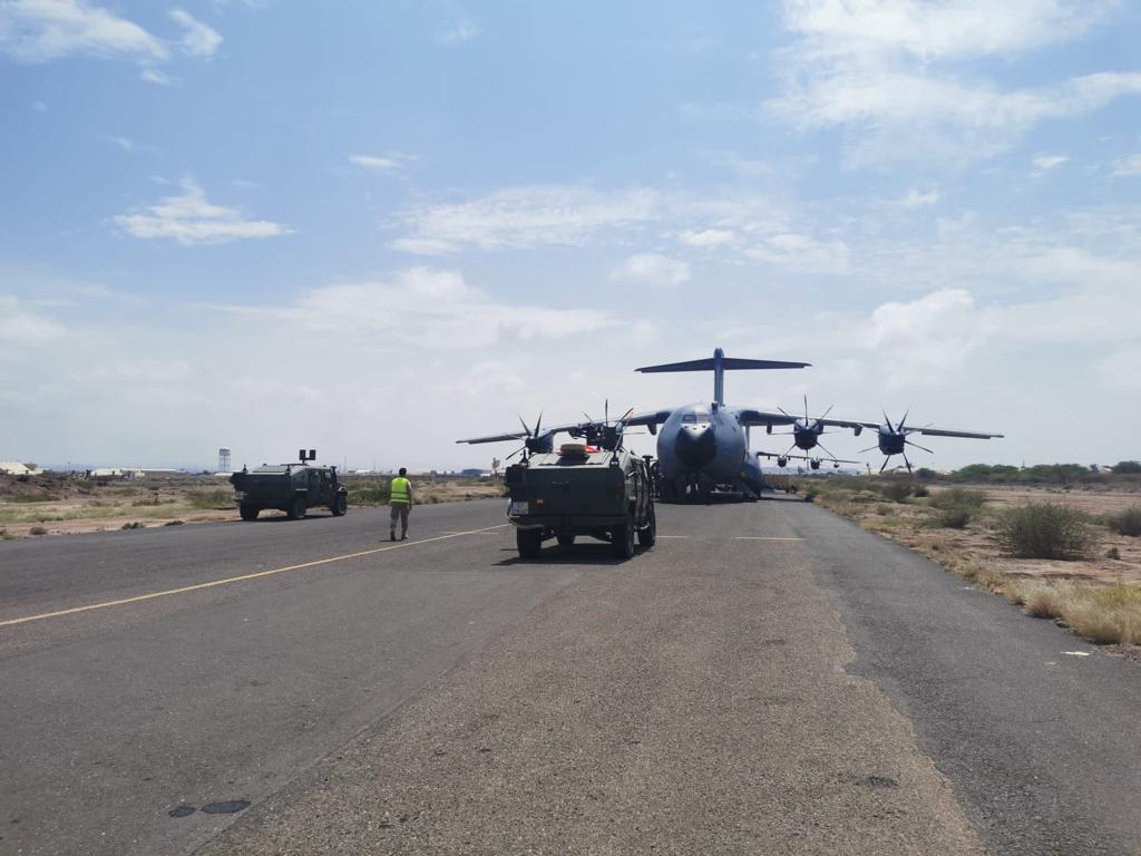El avión con los españoles rescatados de Sudán despegó de Jartum pasadas las 23.00 horas del domingo con destinos a Yibuti, el país que ha servido de base a España para realizar la operación. En ese pequeño país está desde hace casi dos décadas el Destacamento Orión, que lucha contra la piratería en el Índico. Foto: Ministerio de Defensa.