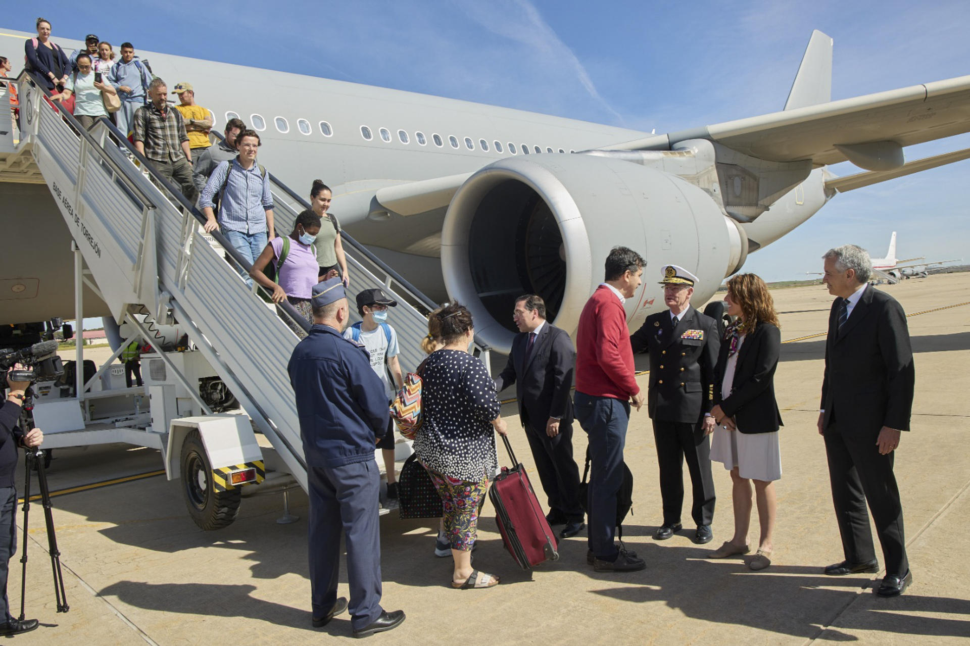 El ministro de Asuntos Exteriores, José Manuel Albares, y el Jefe del Estado Mayor de la Defensa (JEMAD), almirante general Teodoro López Calderón, han recibido este lunes en la base aérea de Torrejón (Madrid) a los ciudadanos rescatados. Foto: EFE/Ministerio de Exteriores