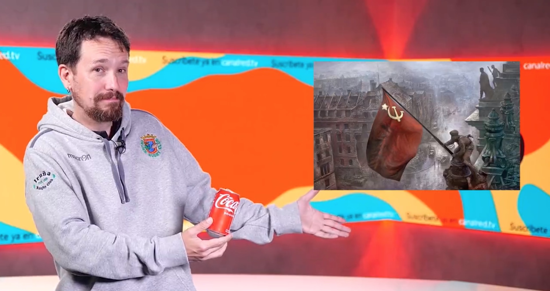 Además, Pablo Iglesias bromea con que podría haber anunciado la compra de la frecuencia de 7NN contándolo "a la venezolana…" –mostrando un vídeo de Hugo Chávez con su famoso "exprópiese"– o si es mejor "contároslo de una forma más clásica y elegante", para lo que muestra la fotografía de la toma de Berlín por las tropas de la URSS atribuida a Yevgeny Khaldei, de la agencia TASS, cuando pidió a varios soldados que posaran ondeando la bandera roja en todo lo alto del Reichstag. Una fotografía que originalmente se retocó ya que alguno de los soldados llevaba varios relojes en la muñeca fruto del saqueo.