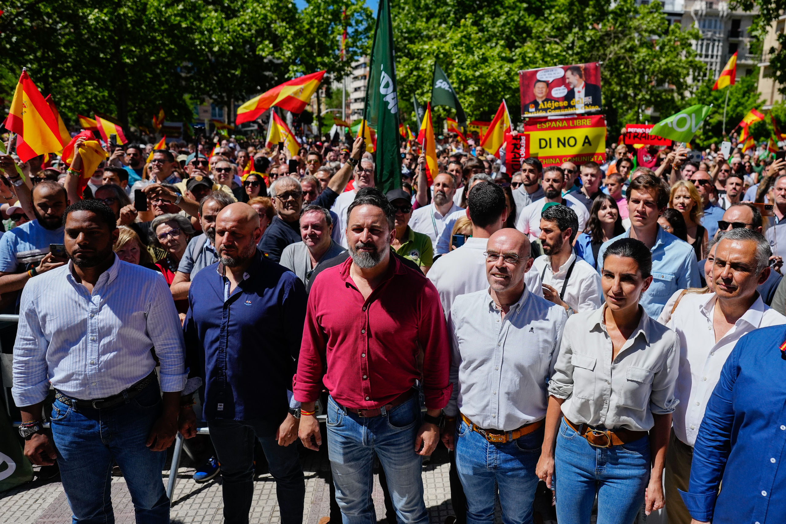 En esa imagen, se equiparaba a Feijóo y Ayuso con Bildu, Podemos y Maduro. "Algunos se declaran ofendiditos", ha criticado Abascal que ha asegurado que "no hemos comparado en esa lona a Bildu con el PP. En esa lona, hay personas muy distintas, de distinta catadura moral, pero todos se comen el pastel de la agenda 2030".