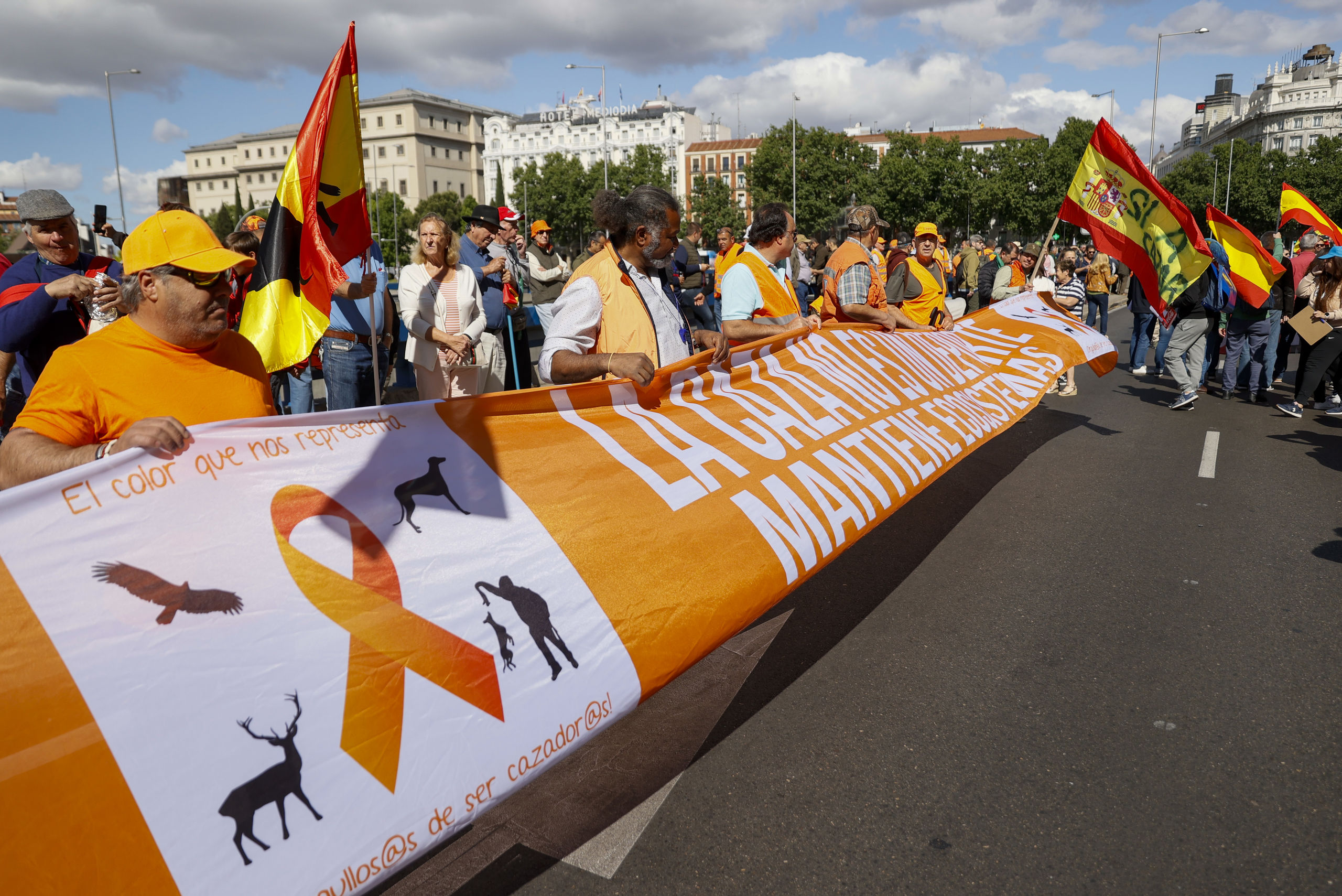 Un cazador participa en la manifestación del mundo rural en Madrid. Más de 300 asociaciones han acudido a la capital agrupadas en la plataforma SOS Rural,