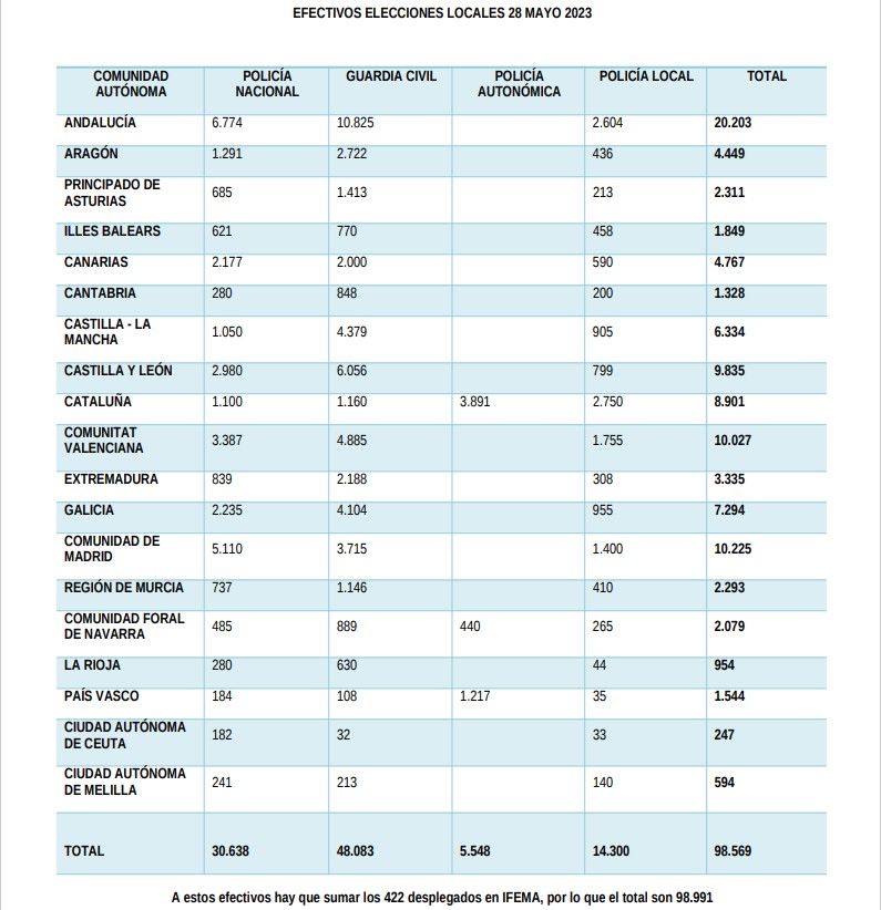 Millones de españoles están llamados a las urnas el próximo domingo 28 de mayo para elegir a los que serán sus representantes políticos en ayuntamientos, diputaciones, instituciones forales y casi todas las comunidades autónomas. Una jornada en la que se sacará a la calle el mayor dispositivo de seguridad de la democracia, con casi 100.000 agentes de las Fuerzas de Seguridad del Estado y los cuerpos de policía autonómicos y locales.