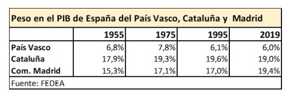 Otro de los datos curiosos que pone de relevancia el informe de la Universidad San Pablo CEU está relacionado con la pujanza económica de la región y el efecto que el terrorismo ha supuesto para ella. Aporta los datos del peso que en la economía españolaba aportaban las regiones del País Vasco, Cataluña y el área de Madrid suponían en 1955, en 1975, en 1995 y en 2019. Lo que se aprecia es un descenso general de la importancia económica del País Vasco y un aumento de Cataluña (frenado por el proceso independentista) y de Madrid.
