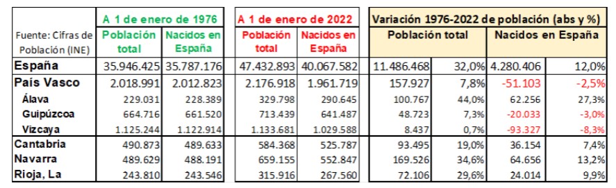 El estudio deja en evidencia cómo la comunidad vasca ha perdido población de origen español durante estos últimos cuarenta años, ganando solo población neta gracias a la inmigración extranjera, mientras que otras regiones limítrofes al País Vasco como La Rioja, Cantabria o Navarra han ganado población tanto española de origen como proveniente de otros países.