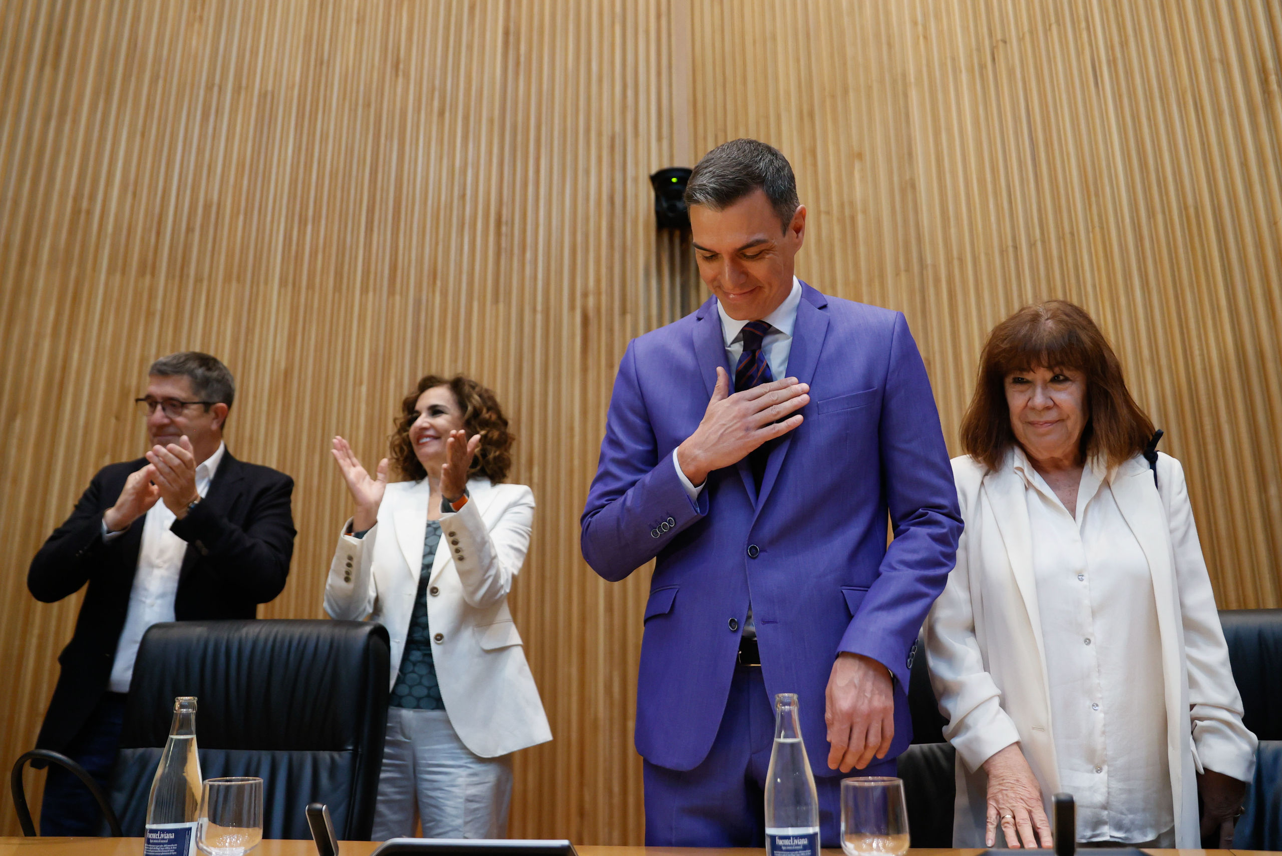 Los diputados recibieron a Sánchez en pie, que recibió la ovación con la mano en el pecho rodeado de Patxi López, Santos Cerdán, Cristina Narbona y una especialmente efusiva María Jesús Montero. Pero la ovación inicial, de un minuto con los parlamentarios en pie, no fue la única: el presidente fue interrumpido quince veces con más aplausos en una escena que recordaba a una magistral descripción de Alexander Soljenitsin, en Archipiélago Gulag, de una reunión de miembros del Partido Comunista de la URSS: