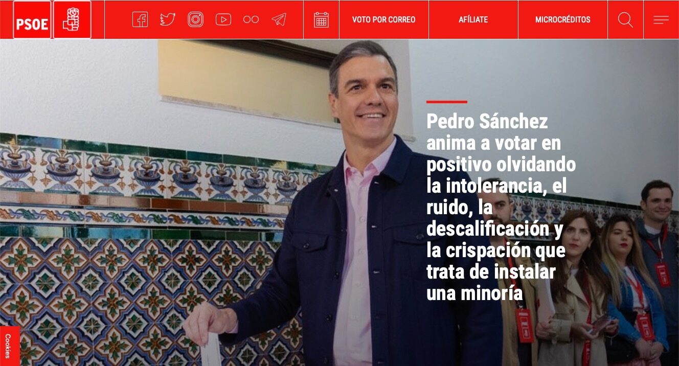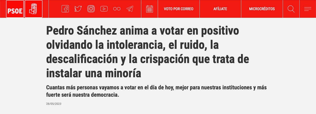 "El secretario general del PSOE y presidente del Gobierno, Pedro Sánchez, ha animado a la ciudadanía, tras ejercer su derecho al voto en Madrid, a acudir a votar "en positivo". "Que lo hagamos en positivo olvidando esta intolerancia, este ruido, esta descalificación, esta crispación que tratan de instalar una minoría" y que "él mismo ha sufrido justo cuando comenzaba a atender a los medios de comunicación tras depositar sus papeletas en las urnas", narraba una de las informaciones. Prácticamente todo del 28-M, antes del batacazo electoral.