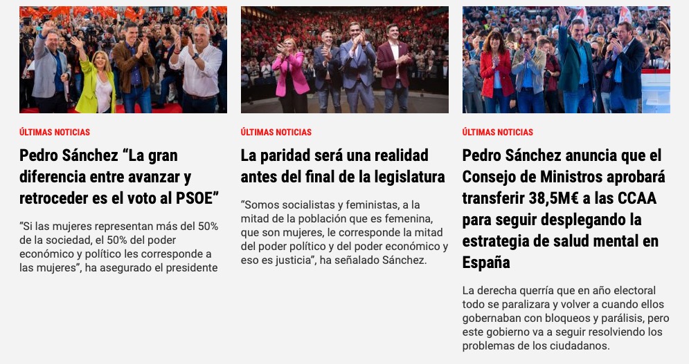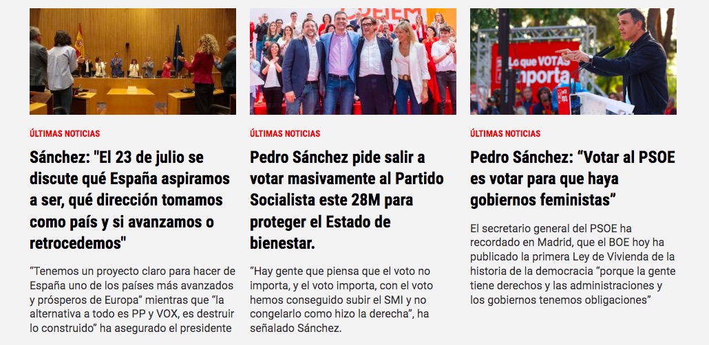 Pero lo cierto es que el PSOE está noqueado. La web del partido permanecía congelada este miércoles a la hora de redactar esta información y tan sólo mostraba fotos y noticias de campaña hasta el momento de la debacle del 28-M, el momento del shock. Sólo una información se renovó de urgencia: el discurso de Sánchez en el Congreso. También aparecía la del nuevo y bochornoso discurso del dóberman contra el PP, incluido porque es un bloque de Twitter y se refresca de forma automática.