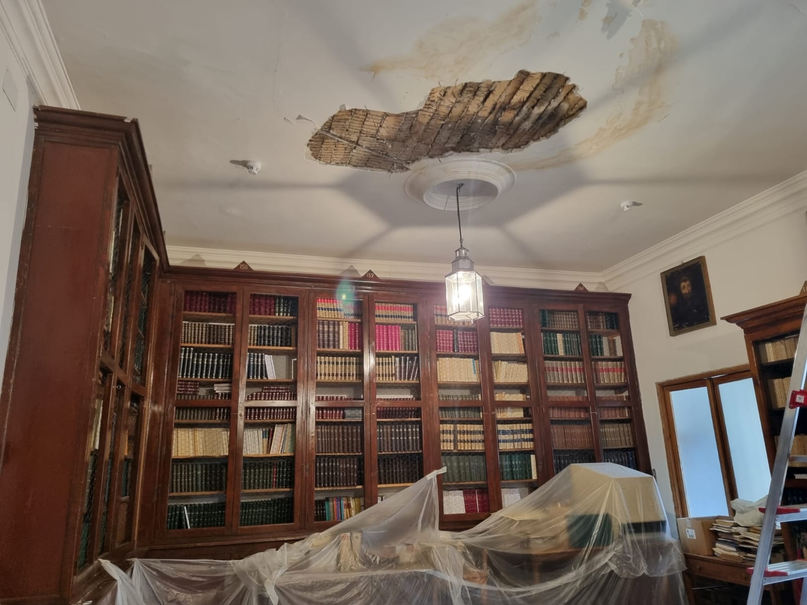 Y lo mismo sucede en los techos de la Biblioteca Real del Palacio de El Escorial. Cualquiera pensaría que se trata de una biblioteca cualquiera en una casa abandonada. Y eso es precisamente lo que denuncian los trabajadores: el abandono al que Sánchez ha condenado a los Reales Sitios que conforman nuestro Patrimonio Nacional.