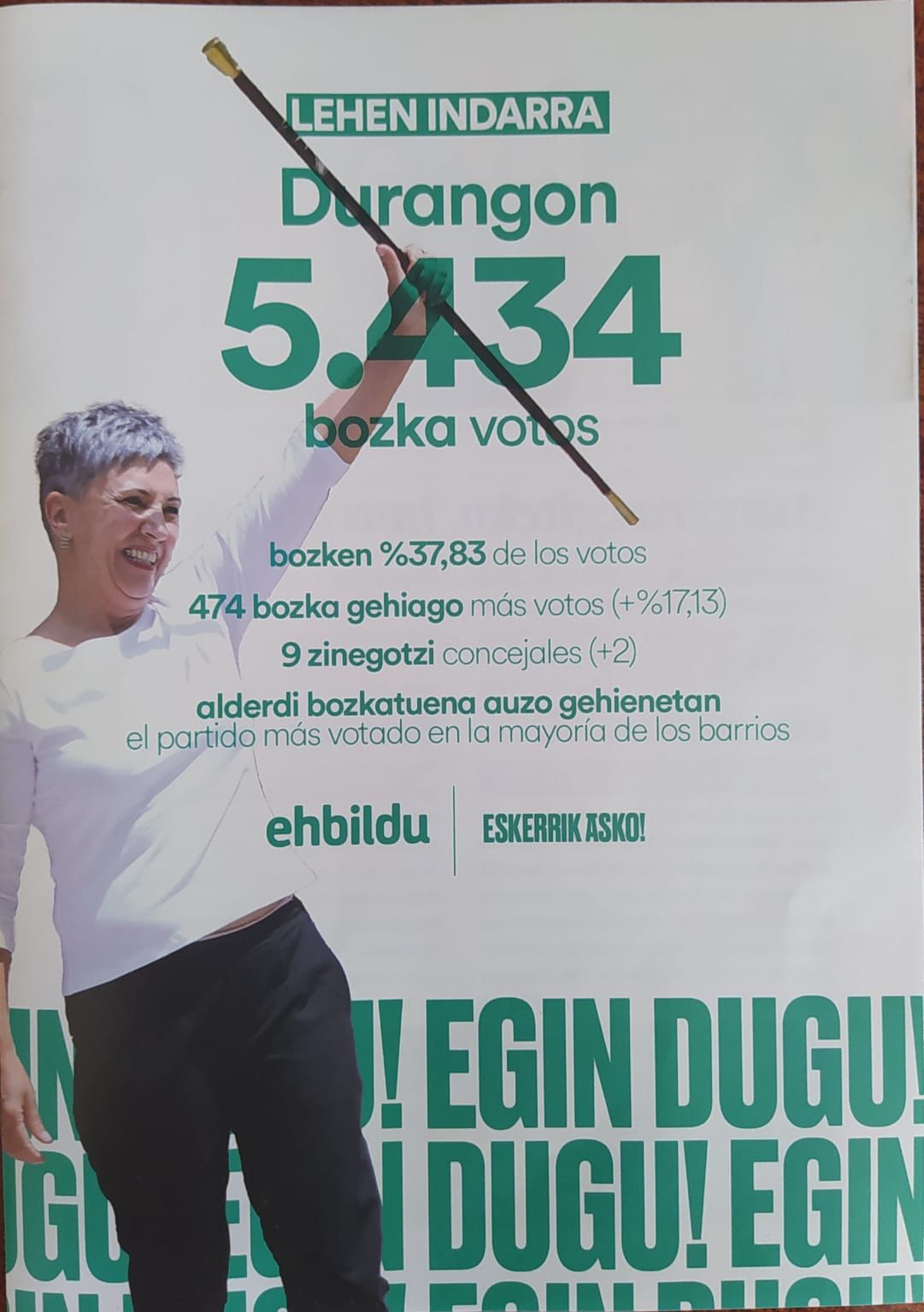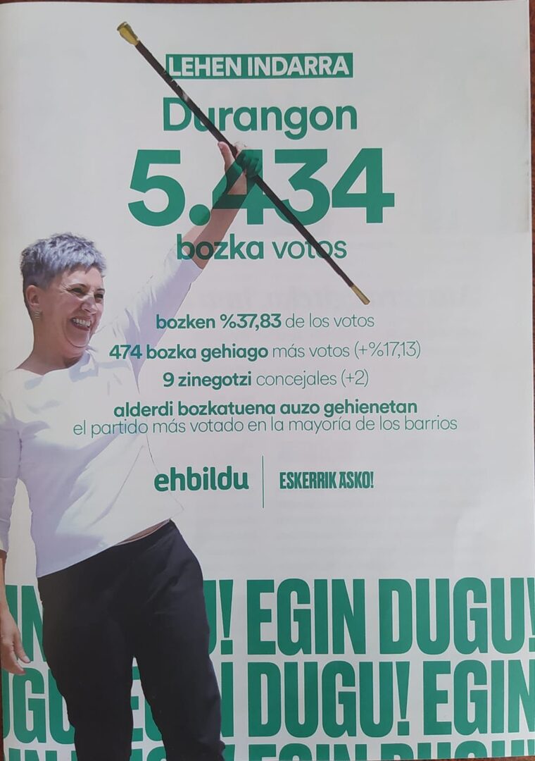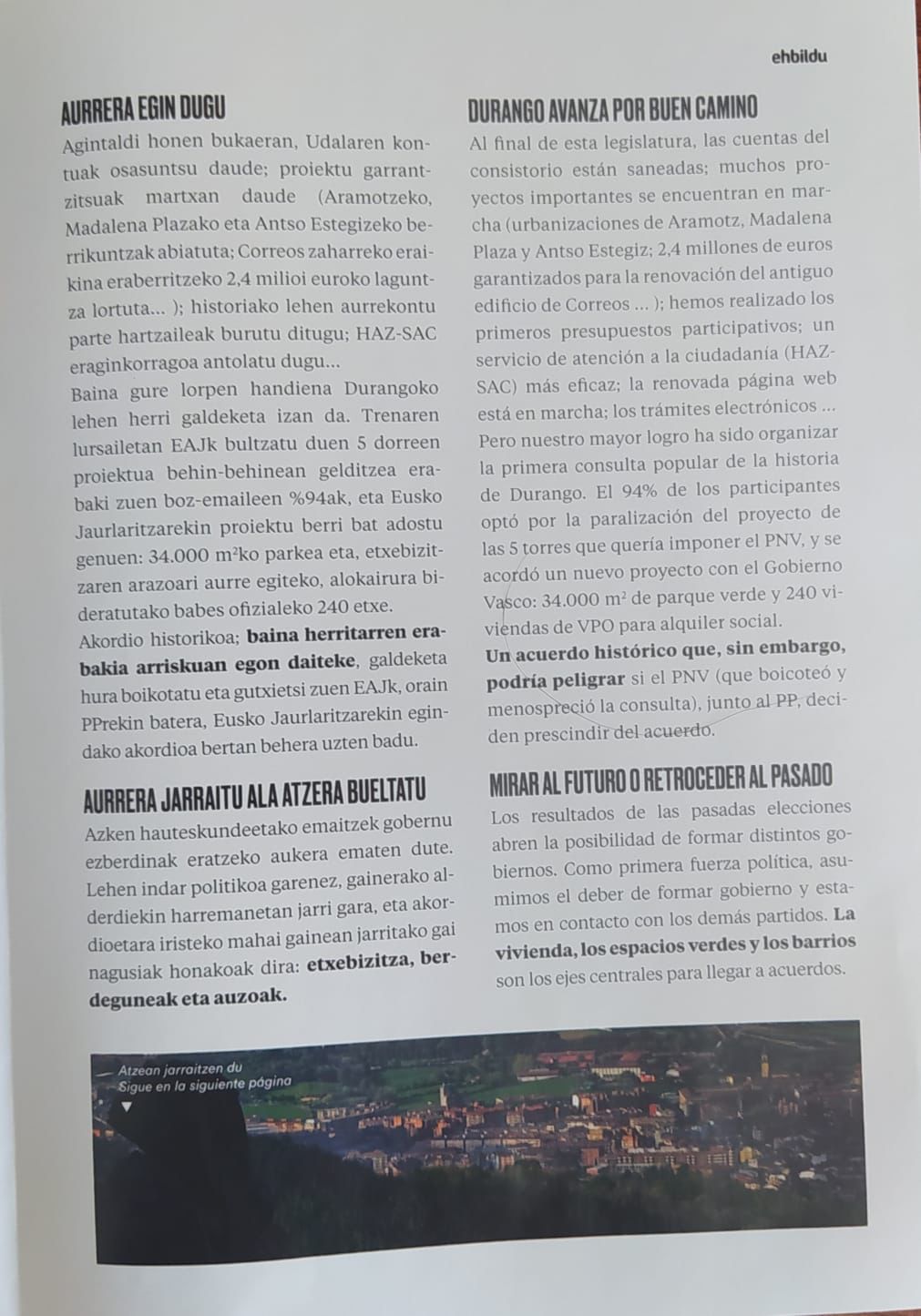 El folleto de Bildu insiste en que "al final de esta legislatura, las cuentas del consistorio están saneadas; muchos proyectos importantes se encuentran en marcha […]; hemos realizado los primeros presupuestos participativos; un servicio de atención a la ciudadanía (HAZ-SAC) más eficaz; la renovada página web está en marcha; los trámites electrónicos…". Y es que Durango está ahora ya gobernada por los proetarras. Ellos deslizan una peculiar iniciativa que huele a lo que huele: "Pero nuestro mayor logro ha sido organizar la primera consulta popular de la historia de Durango. El 94% de los participantes optó por la paralización del proyecto de las 5 torres que quería imponer el PNV, y se acordó un nuevo proyecto con el Gobierno Vasco: 34.000 m2 de parque verde y 240 viviendas de VPO para alquiler social. Un acuerdo histórico que, sin embargo, podría peligrar si el PNV (que boicoteó y menospreció la consulta), junto al PP, deciden prescindir del acuerdo".
