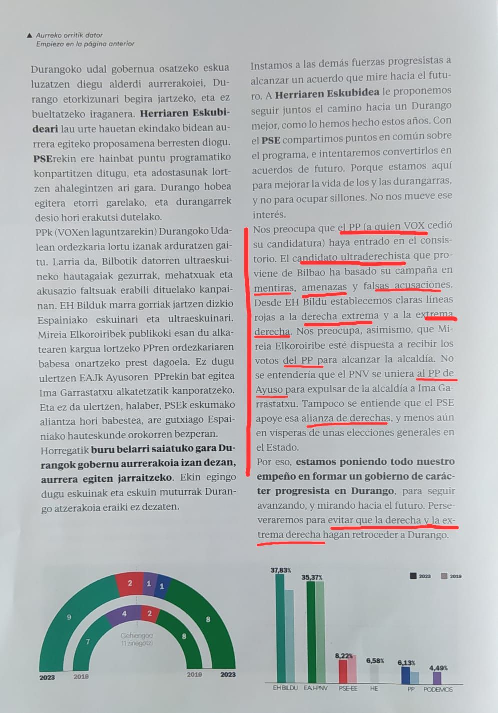 El aviso se hace extensivo a quienes pueden entrar en la más mínima relación con Carlos García: "Nos preocupa, asimismo, que Mireia Elkoroiribe esté dispuesta a recibir los votos del PP para alcanzar la alcaldía. No se entendería que el PNV se uniera al PP de Ayuso para expulsar de la Alcaldía a Ima Garrastatxu". Y "tampoco se entiende que el PSE apoye esa alianza de derechas, y menos aún en vísperas de unas elecciones generales en el Estado", añaden los de Bildu. "Por eso, estamos poniendo todo nuestro empeño en formar un gobierno de carácter progresista en Durango, para seguir avanzando, y mirando hacia el futuro", explican. Y lanzan la última advertencia: "Perseveraremos para evitar que la derecha y la extrema derecha hagan retroceder a Durango".