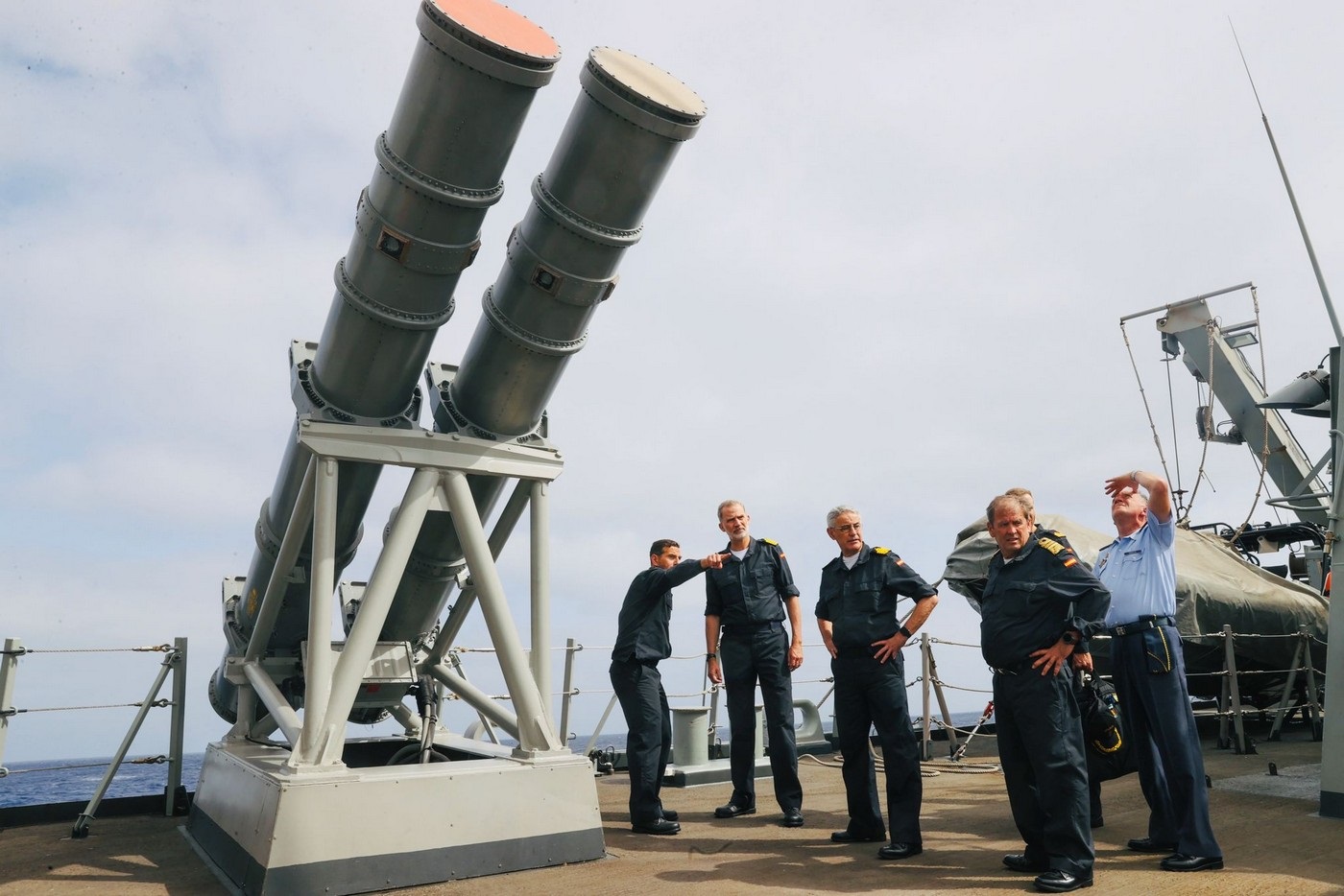 Felipe VI asistió este jueves al ejercicio de lanzamiento de armas Sinlex a bordo de la fragata Méndez Núñez y del portaaronaves Juan Carlos I de la Armada Española.