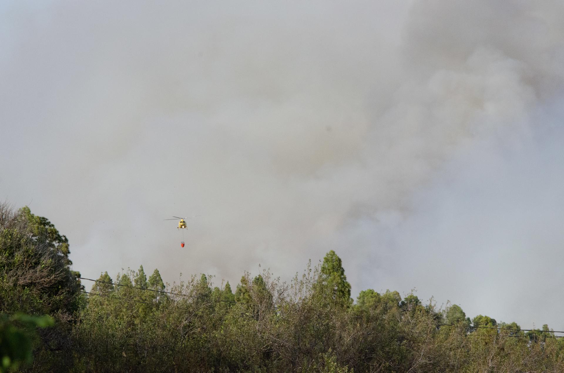 Un helicóptero lanza agua sobre las llamas del incendio forestal de Puntagorda en La Palma que ha obligado a desalojar varias viviendas y ha llevado a la evacuación de 32 vecinos de las proximidades del fuego.