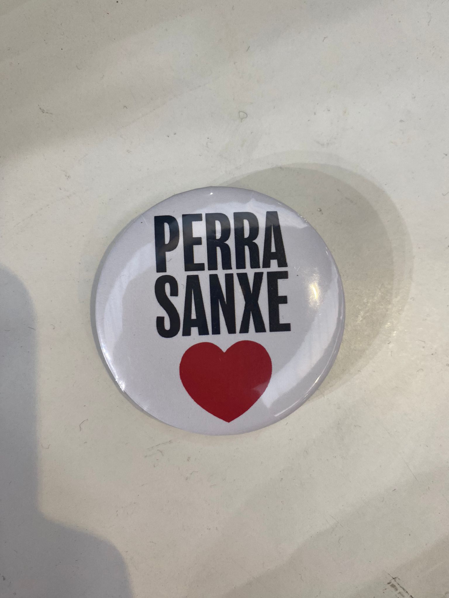 La chapa con la leyenda "perra sanxe" que se repartió en el mitin del PSOE en Getafe. También había versión masculina, cuenta Rubén Fernández.