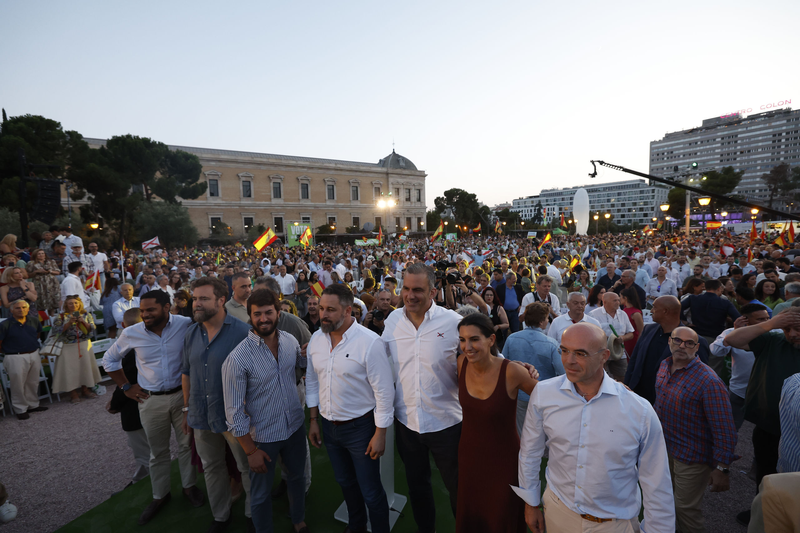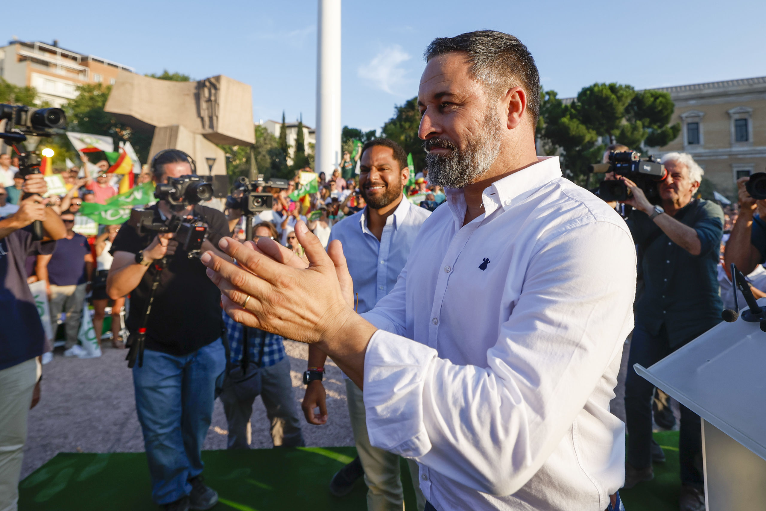El candidato de Vox a la presidencia del Gobierno, Santiago Abascal (d) y el líder de la formación en Cataluña Ignacio Garriga (detrás) durante el acto electoral de fin de campaña, este viernes en la madrileña plaza de Colón, escenario de múltiples concentraciones de la formación.