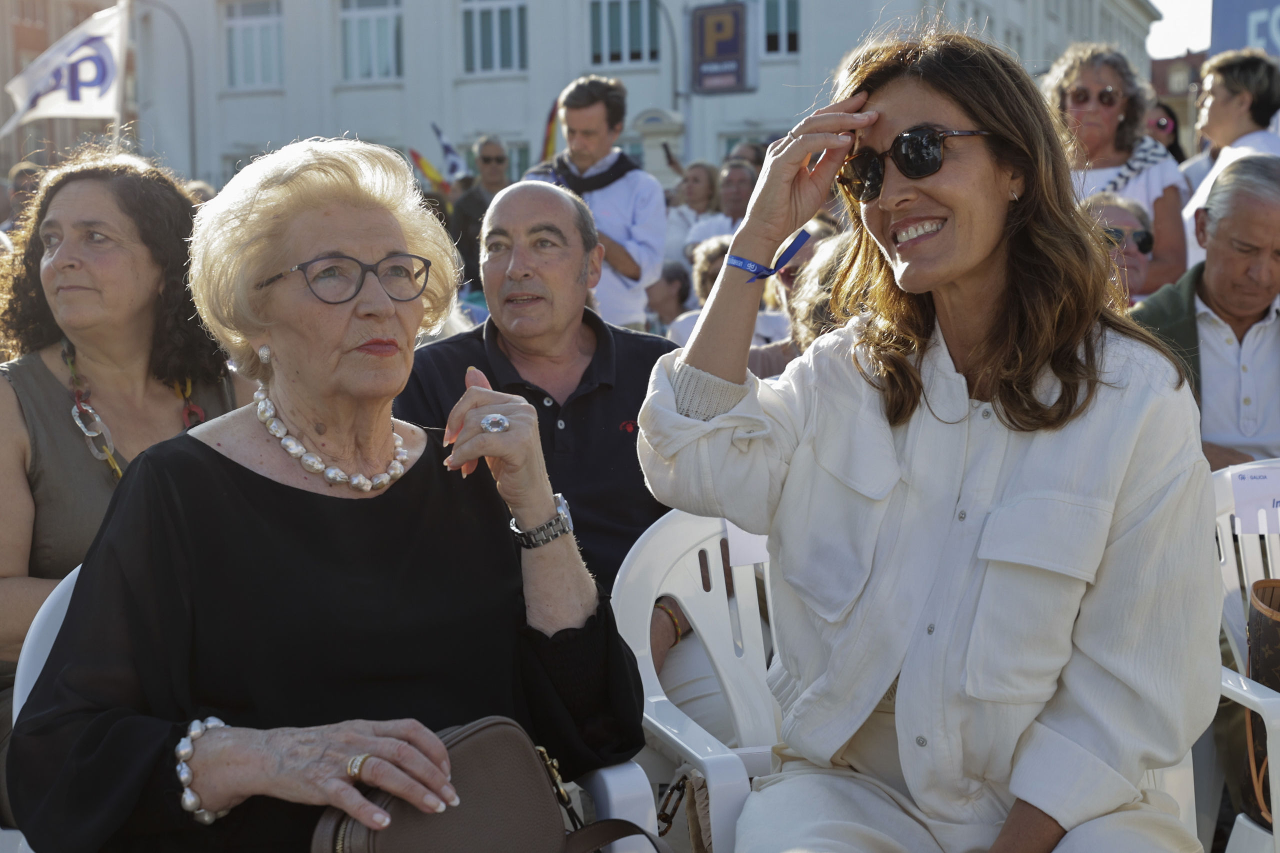 La mujer y la madre del candidato del PP a las elecciones generales, Alberto Núñez Feijóo, durante el acto de cierre de campaña celebrado este viernes en La Coruña