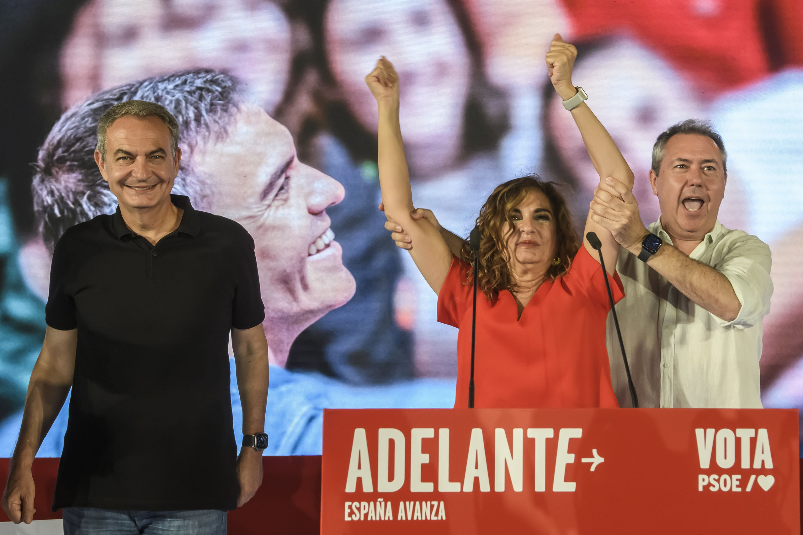 El expresidente del Gobierno José Luis Rodríguez Zapatero, uno de los protagonistas de la campaña, con la candidata del PSOE por Sevilla y ministra de Hacienda, María Jesús Montero (c), y el secretario general del PSOE-A, Juan Espadas (d), este viernes, en el cierre de campaña electoral del PSOE, en La Rinconada (Sevilla).