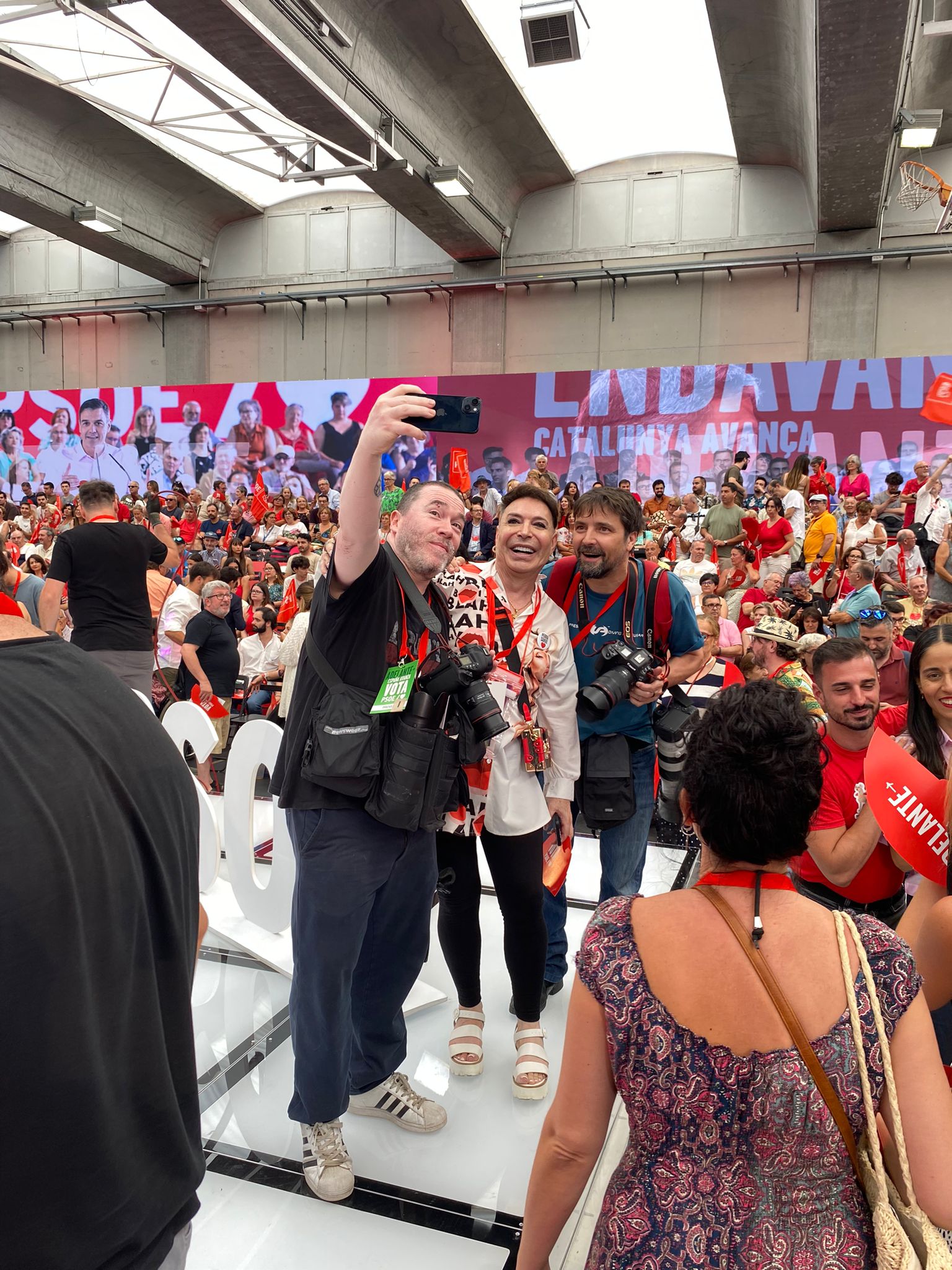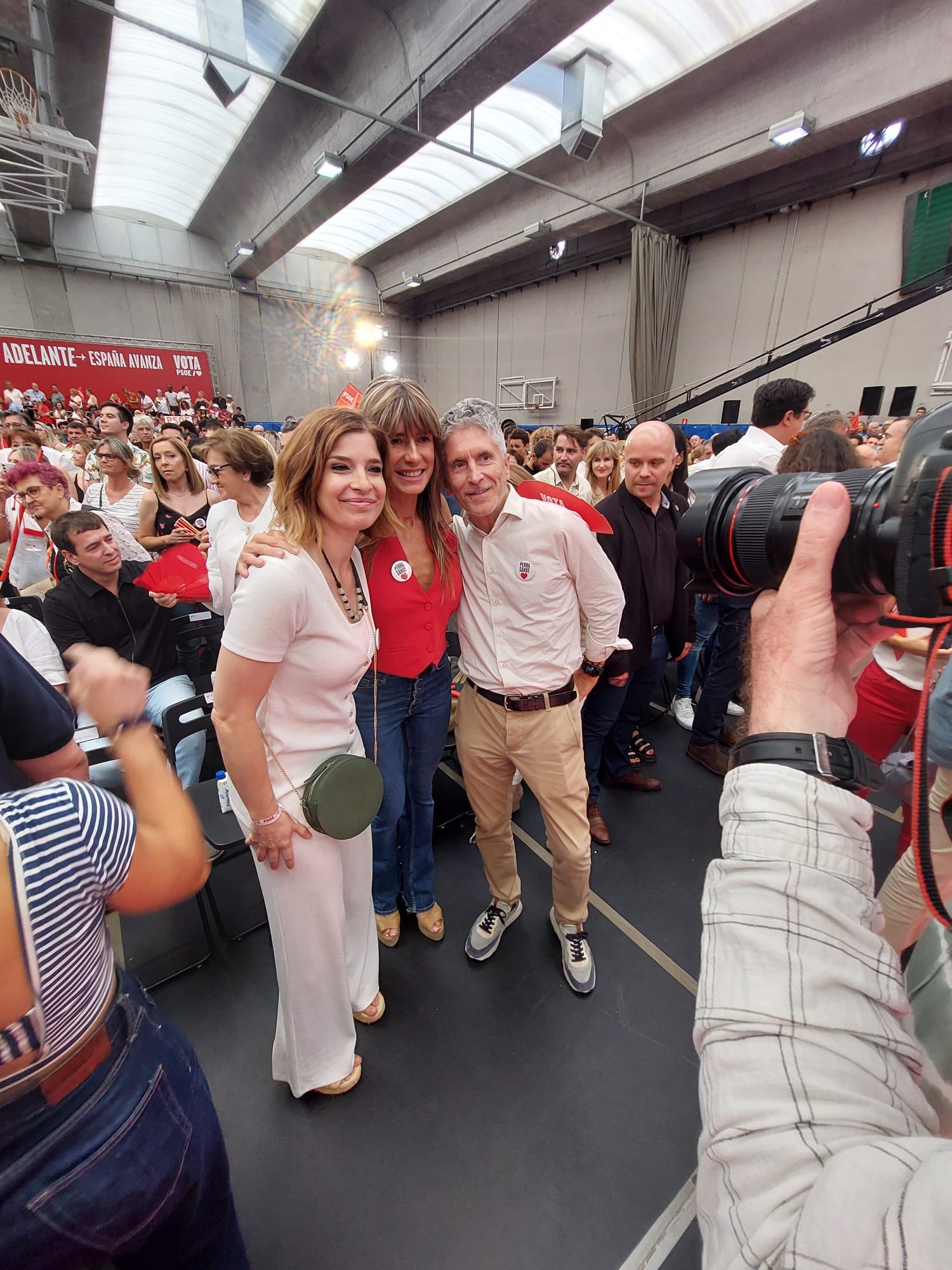 Begoña Gómez, con Marlaska y Hana Jalloul y una chapa de Perro Sanxe, repartidas en el mitin de cierre del PSOE.
