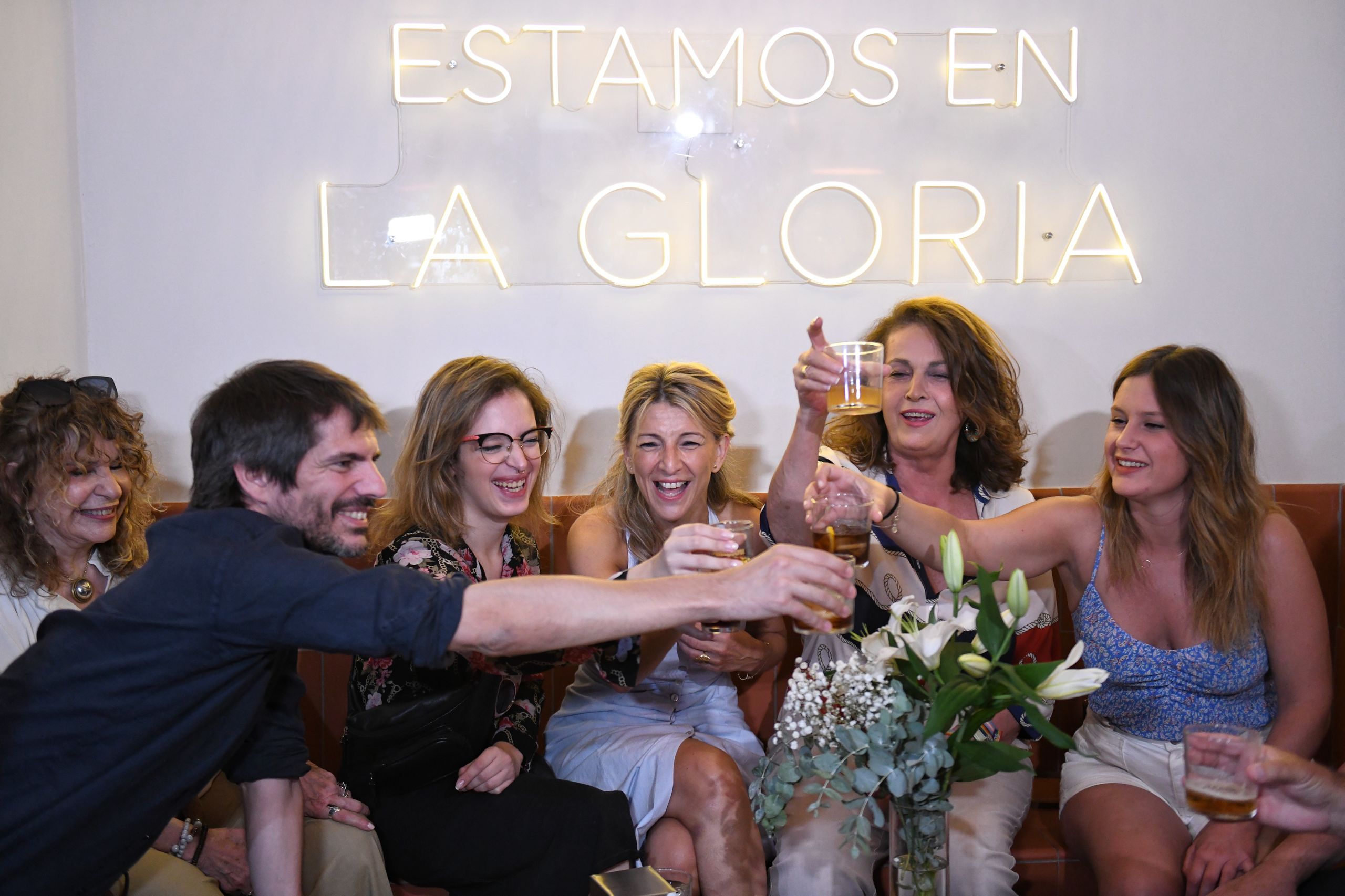 La candidata de Sumar, Yolanda Díaz, ha decidido tomar el aperitivo junto a sus portavoces este sábado de reflexión. Todos brindan con vermut por la campaña realizada. Después irá a ver la película Barbie con algunos de sus compañeros.
