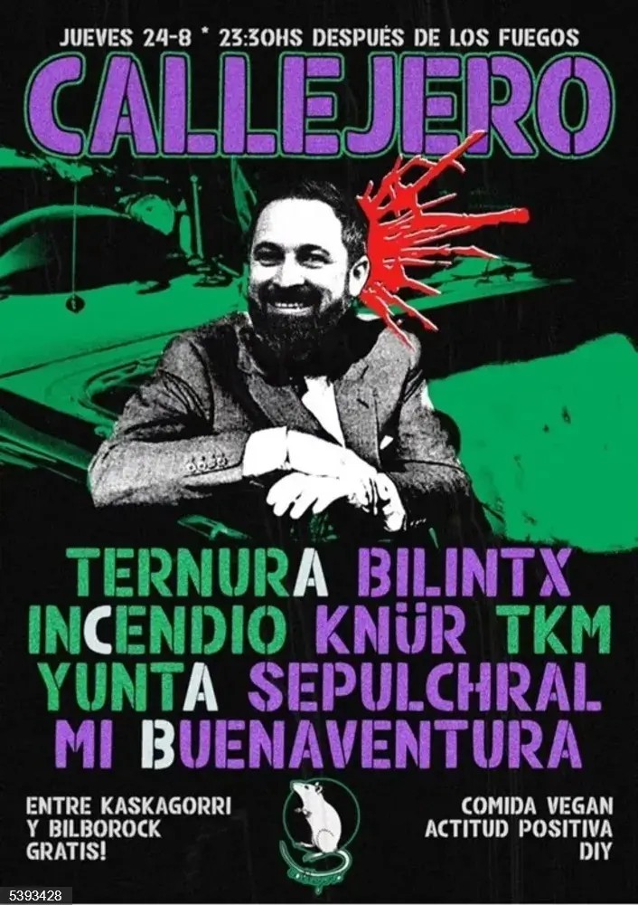 En concreto, el cartel anuncia una serie de conciertos que se celebran este jueves enmarcados en un festival llamado 'Callejero' que organizan colectivos populares en el marco de la Semana Grande de Bilbao, pero fuera del programa oficial del Ayuntamiento de la ciudad. En el cartel puede verse en primer plano a Abascal sonriendo en una imagen en blanco y negro y tras él, a la altura de su nuca, una salpicadura de color rojo que simboliza la sangre.