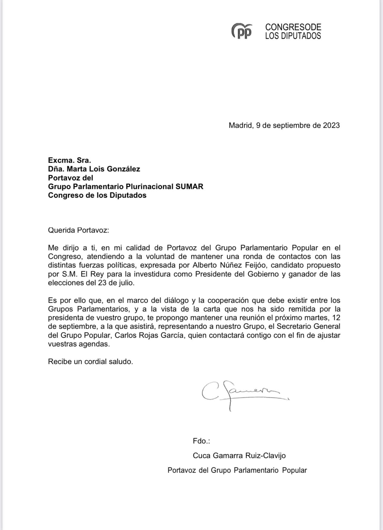 Fuentes del PP informan de que a la vista de que la máxima representante de la coalición, Yolanda Díaz, ha descartado una reunión con Alberto Núñez Feijóo (que nadie había pedido hasta ese momento), y que sí tiene tiempo para hacer —en nombre del Gobierno de España— de mediadora con un prófugo de la justicia pero no para entrevistarse con el candidato designado por el Rey para intentar formar Gobierno, Gamarra informa en dicha misiva que a la interlocutora de Sumar, de producirse la reunión, la recibirá el secretario general del Grupo, Carlos Rojas.