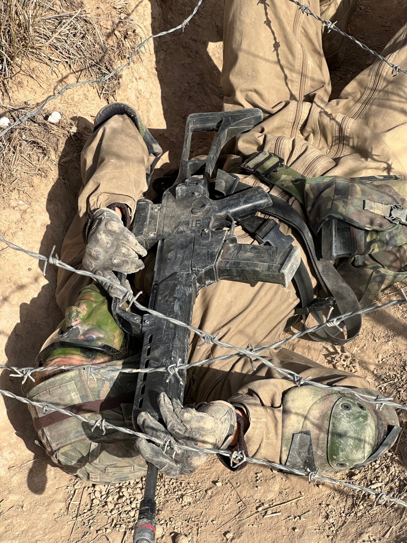 Los cadetes tienen que enfrentarse, por ejemplo, a las difíciles pistas de combate. En la imagen, doña Leonor arrastra su cuerpo y su equipo militar por debajo de una alambrada en una de las pistas de combate.