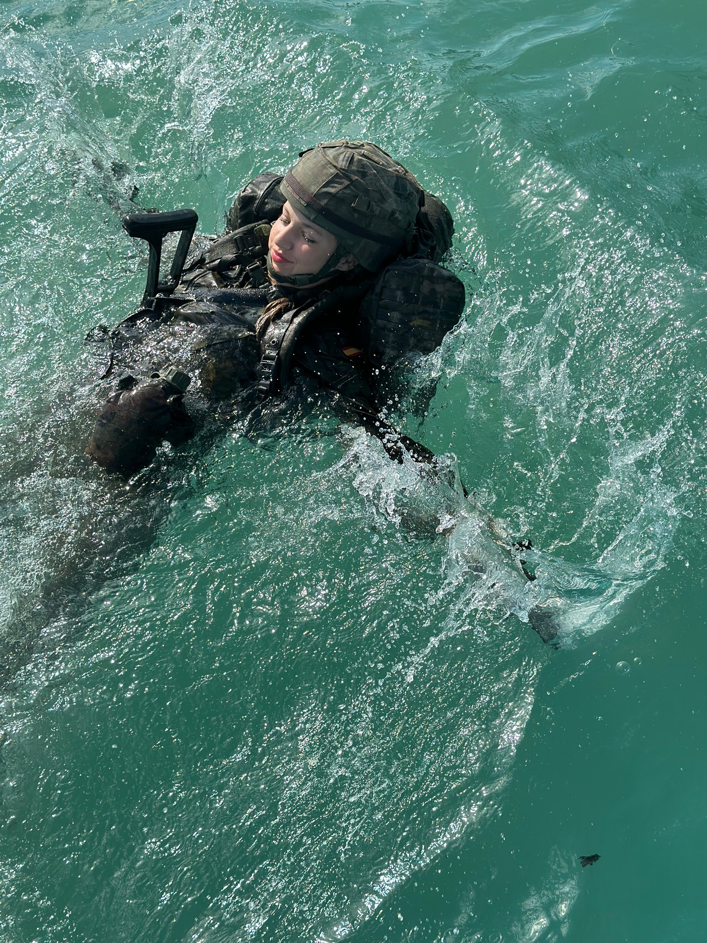 Los cadetes utilizan la piscina de la Academia General Militar para realizar ejercicios de nado portando todo su equipo militar.