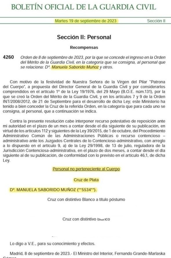 El Boletín Oficial del Instituto Armado ha publicado esta semana la concesión de la Cruz de Plata de la Guardia Civil para Manuela Saborido Muñoz, conocida popularmente como Manolita Chen, quien se hiciera muy conocida como vedette y con espectáculo de travestismo en los años 80. La orden está firmada por el propio ministro Grande-Marlaska.