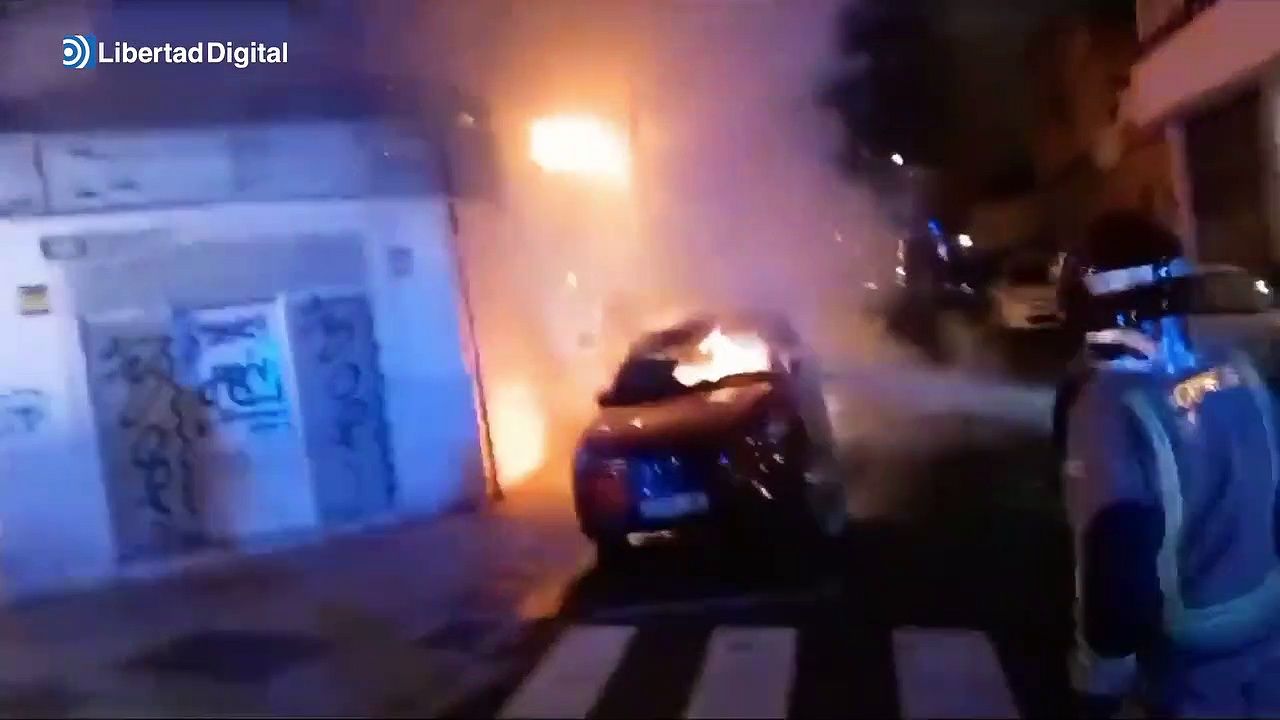 Imágenes de un incendio de contenedores en Palma que ha afectado a varios vehículos. La Policía Nacional se ha hecho cargo de la investigación.