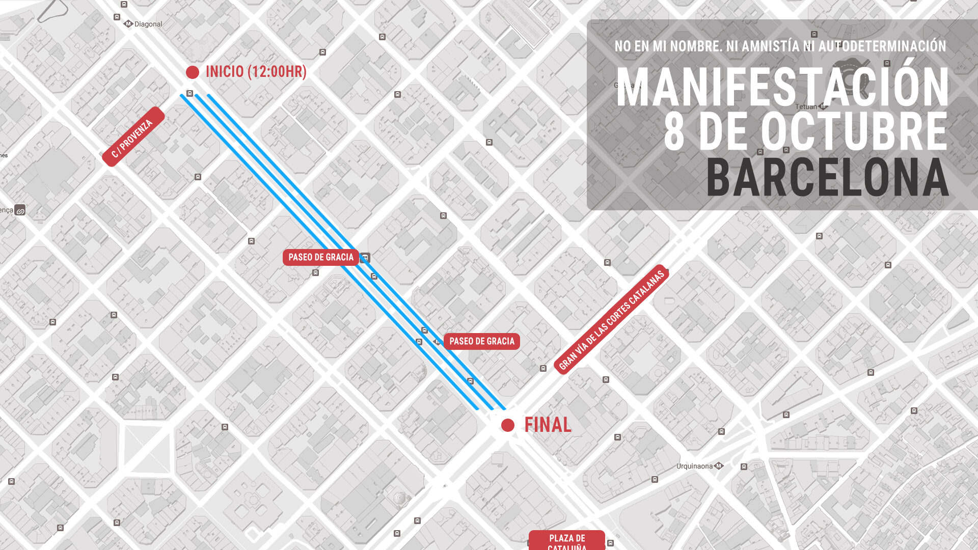 La manifestación en Barcelona arrancará a las 12:00 horas en Paseo de Gracia con Provenza y concluirá en la Gran Vía con el paseo de Gracia, donde estará el escenario desde el que Elda Mata, Alex Ramos, Paco Vázquez y Teresa Freixes se dirigirán a los manifestantes.