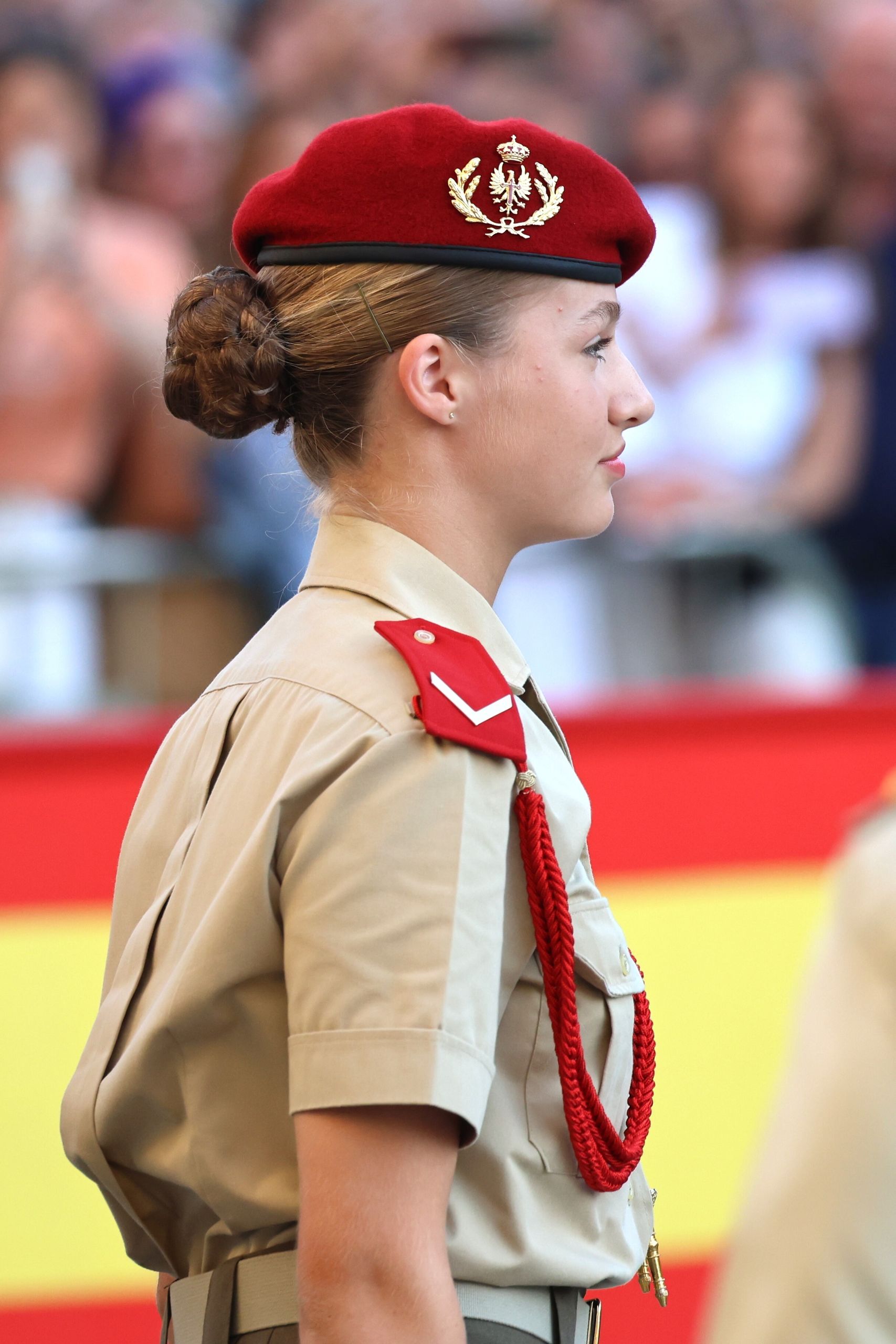 La cadete Leonor de Borbón, como el resto de cadetes de la AGM, ha portado el uniforme de diario. En el hombro, un único angulo como galón que la identifica como alumna del primer curso.